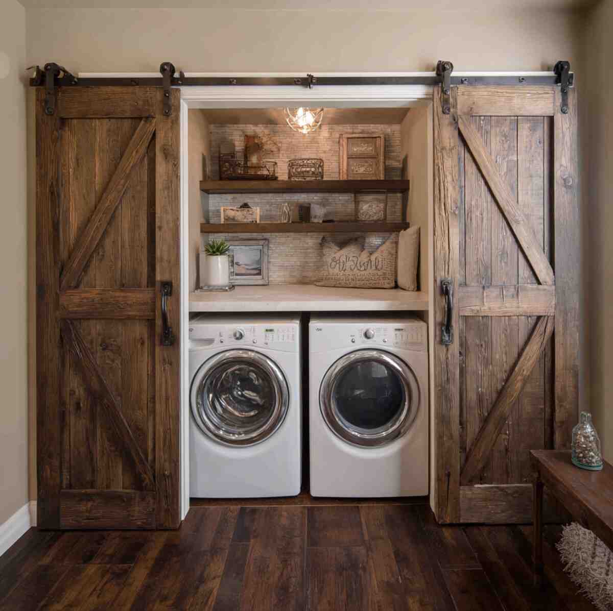 Creating a laundry nook with sliding barn doors is a stylish solution in small basement laundry combo ideas.