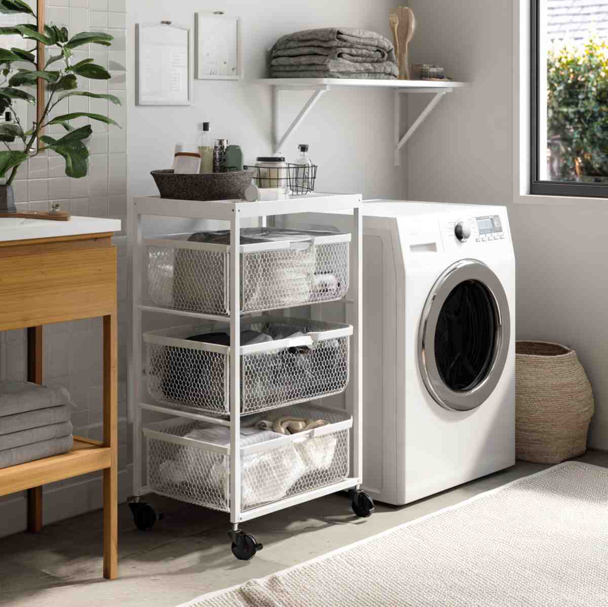 It can hold detergents, folded clothes, and other necessities, then easily move around as needed. This mobility ensures that your laundry area remains functional without crowding the basement.