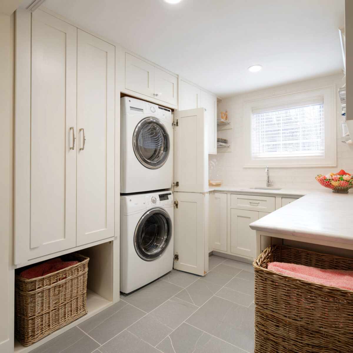 Placing a countertop over your washer and dryer is a practical solution in small basement laundry combo ideas.