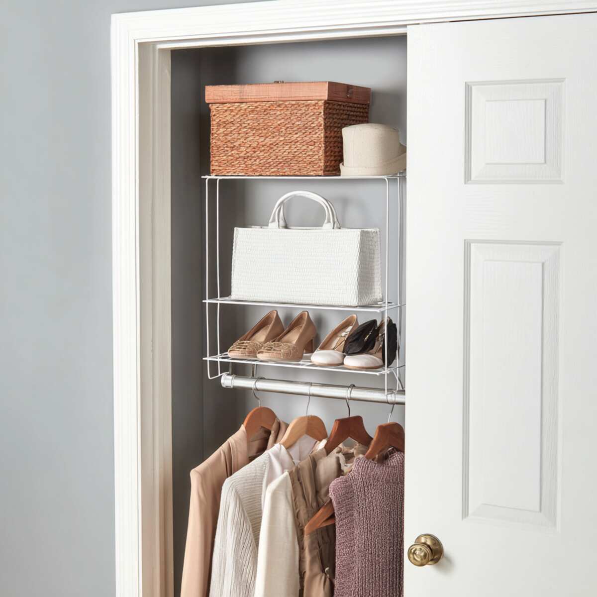 An over-the-door hanging shelf extender makes excellent use of vertical space behind your closet door. It adds extra shelves without needing to drill or rearrange your closet structure.