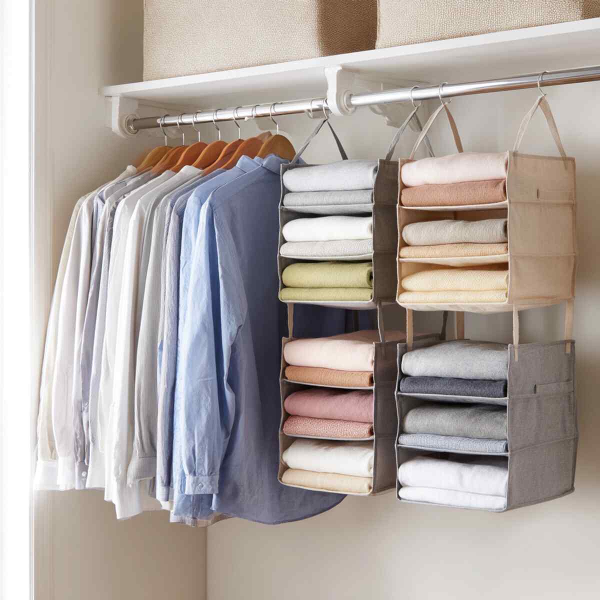 Hanging fabric shelf organizers attach to closet rods and create vertical compartments instantly.