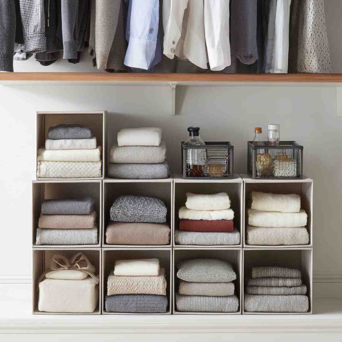 They’re ideal for separating shoes, folded clothes, or accessories neatly. As one of the most versatile Small Closet Shelf Extension Ideas, they help you keep everything visible and easy to grab.