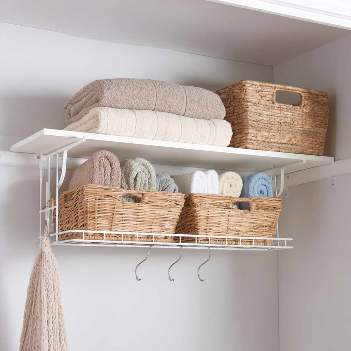 Under-shelf hanging baskets hook underneath your existing shelves, adding instant space for small items like scarves or belts.