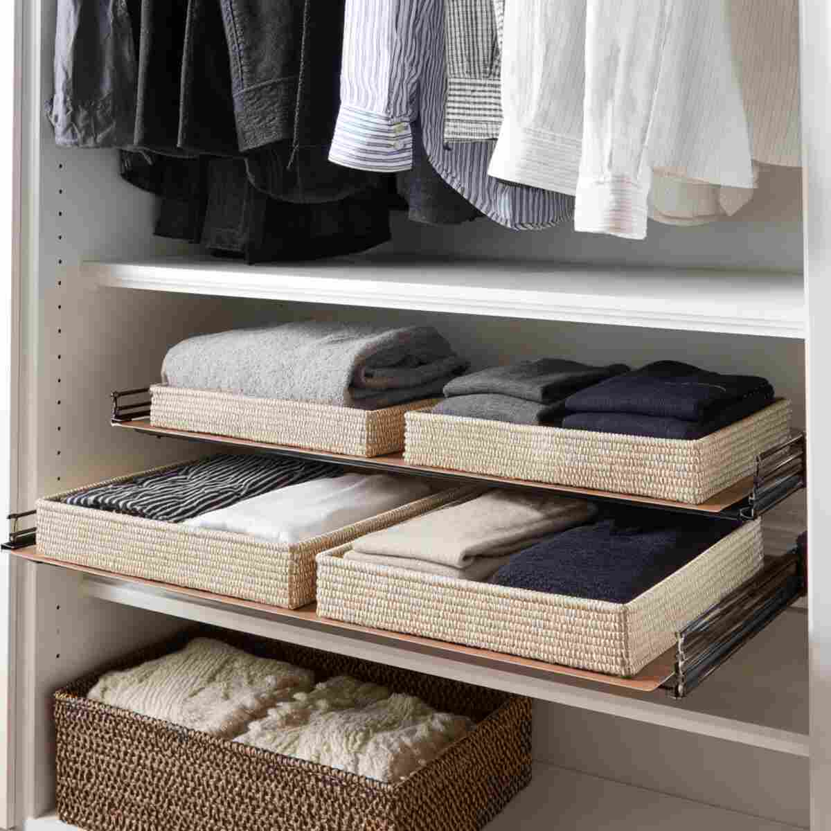 Pull-out sliding shelf trays offer extra depth and accessibility inside your closet. You can store smaller items like jewelry, socks, or folded t-shirts while easily sliding them out for quick access.