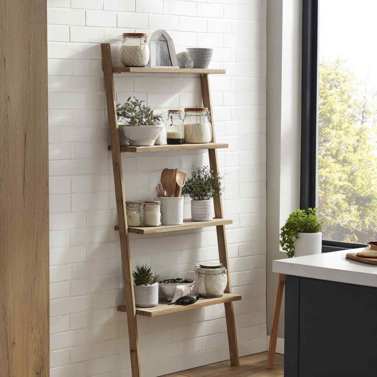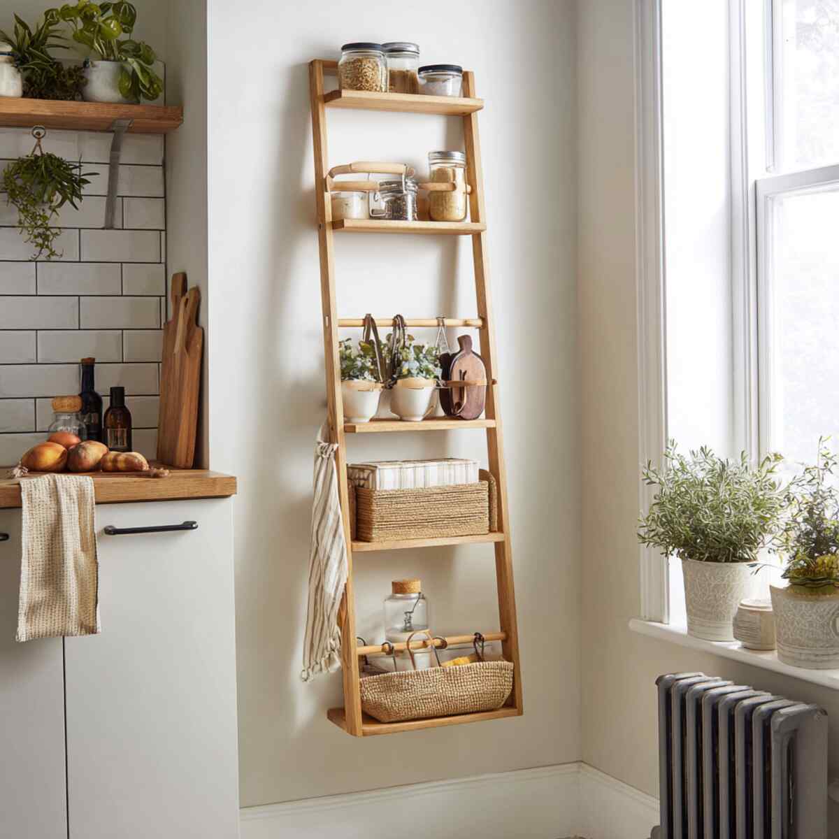 Wall-mounted wooden storage ladders are practical Small Kitchen Storage Ladder Ideas because they use vertical wall space instead of valuable floor space.