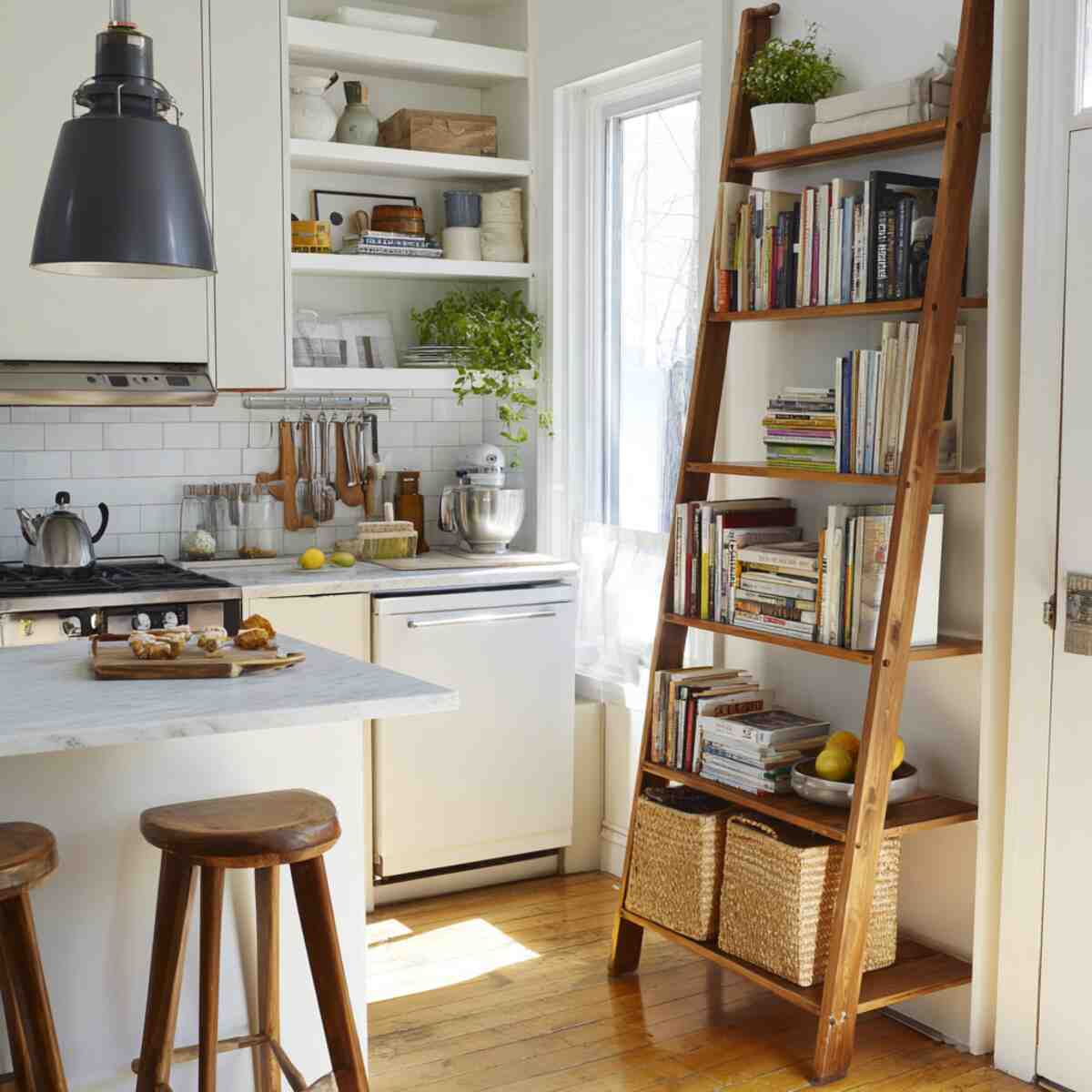 Ladder storage for cookbooks is a functional Small Kitchen Storage Ladder Idea that keeps recipes within reach.