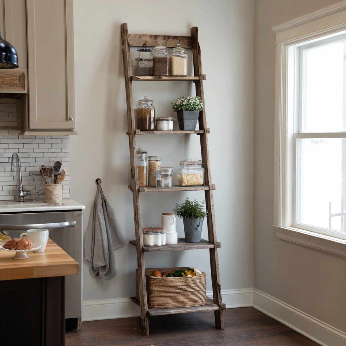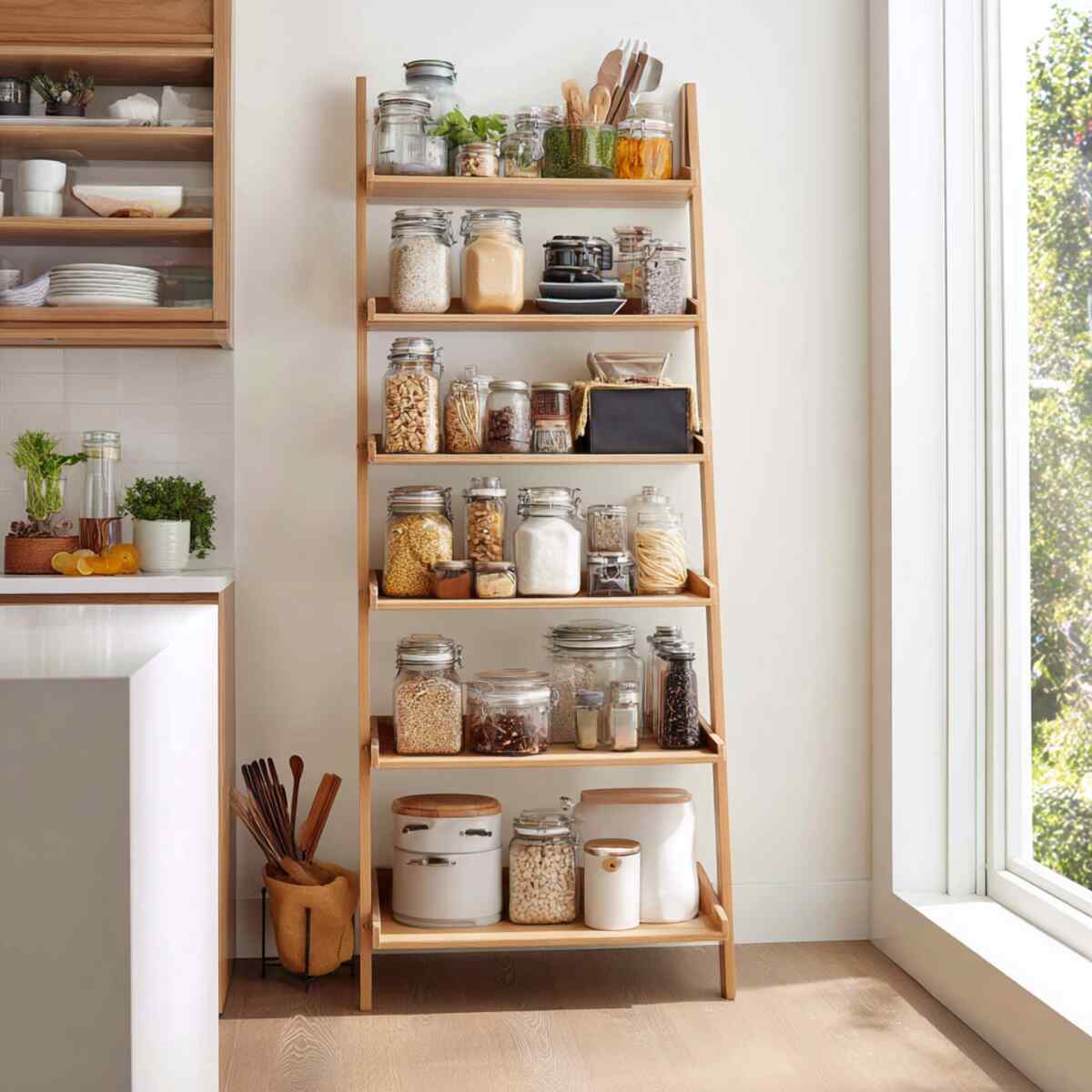 Ladder-style pantry organizers are excellent Small Kitchen Storage Ladder Ideas for homes without a full pantry.
