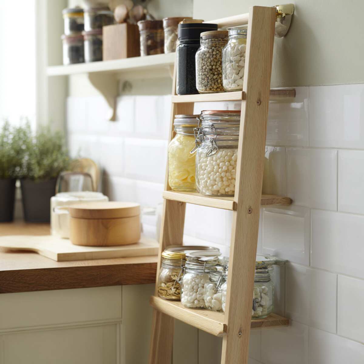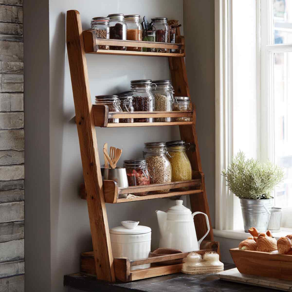 Compact ladders for jars and canisters are efficient Small Kitchen Storage Ladder Ideas for daily essentials.