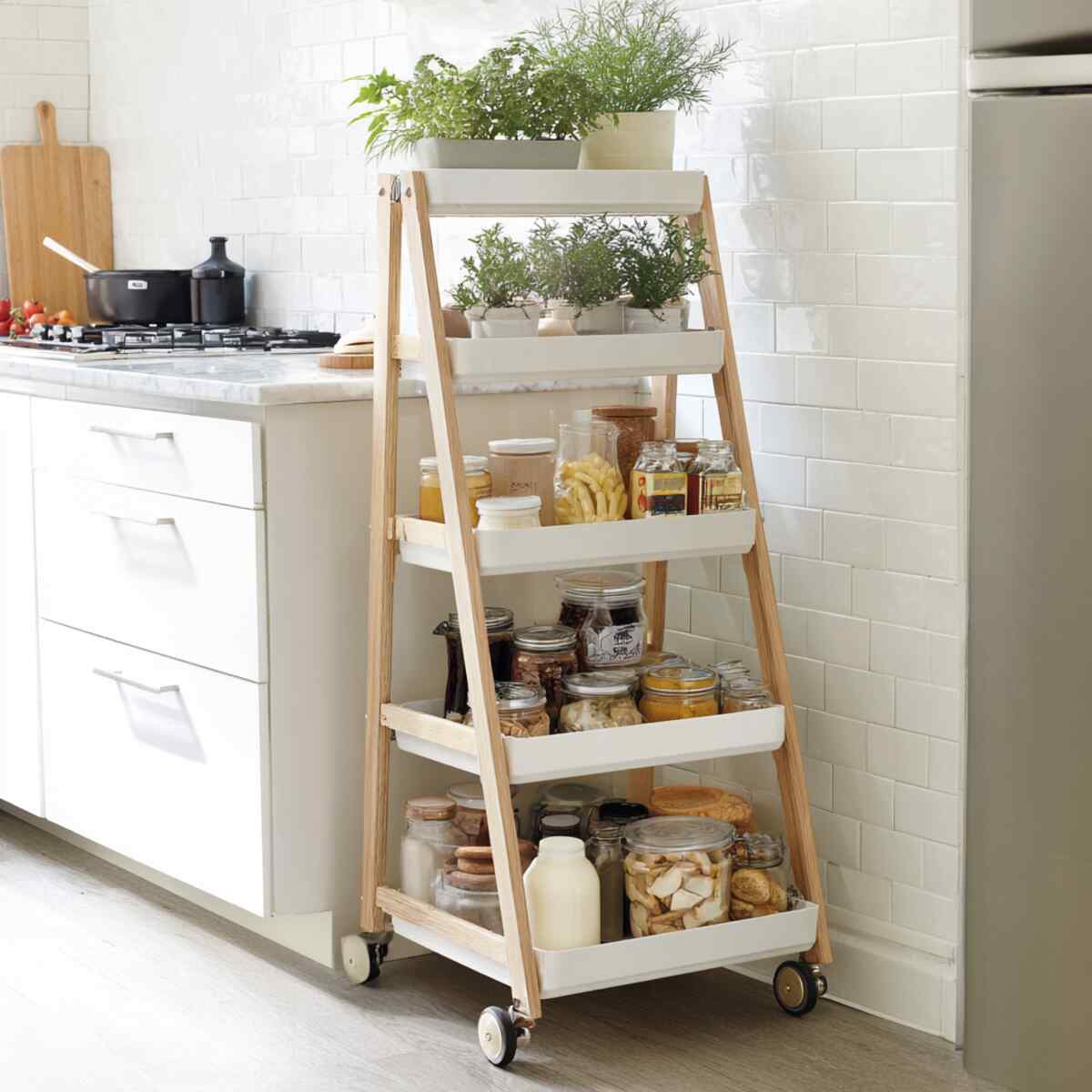 Ladder-style rolling storage racks are flexible Small Kitchen Storage Ladder Ideas that can move where needed.