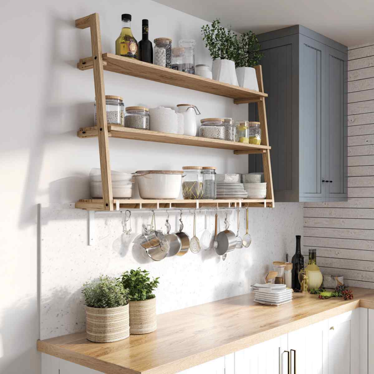 For small kitchens, open ladder shelves make storage feel lighter and less bulky than closed cabinets.