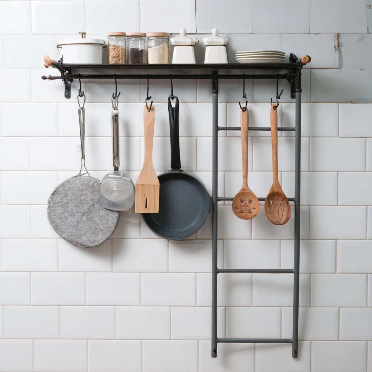 A metal ladder for hanging utensils is a durable and space-saving Small Kitchen Storage Ladder Idea. Hooks attached to the ladder rungs allow utensils to be stored vertically instead of taking up drawer space.