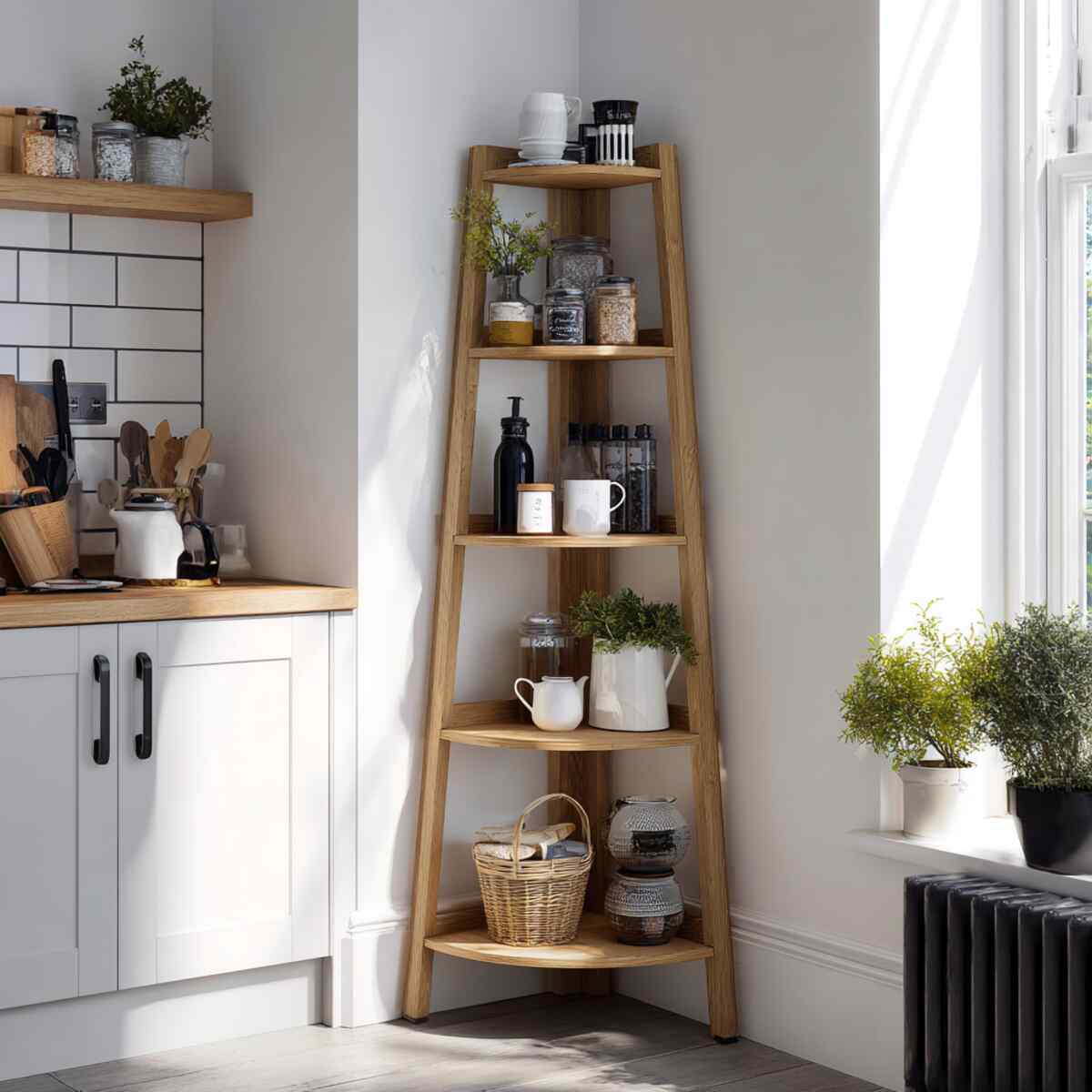Corner ladder shelving units are clever Small Kitchen Storage Ladder Ideas because they utilize often wasted corner space.