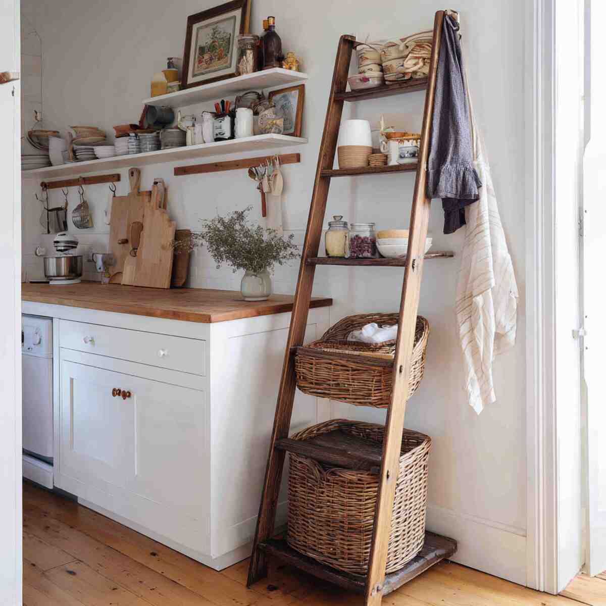 A ladder with basket storage is a versatile Small Kitchen Storage Ladder Idea that combines open shelving with concealed storage.