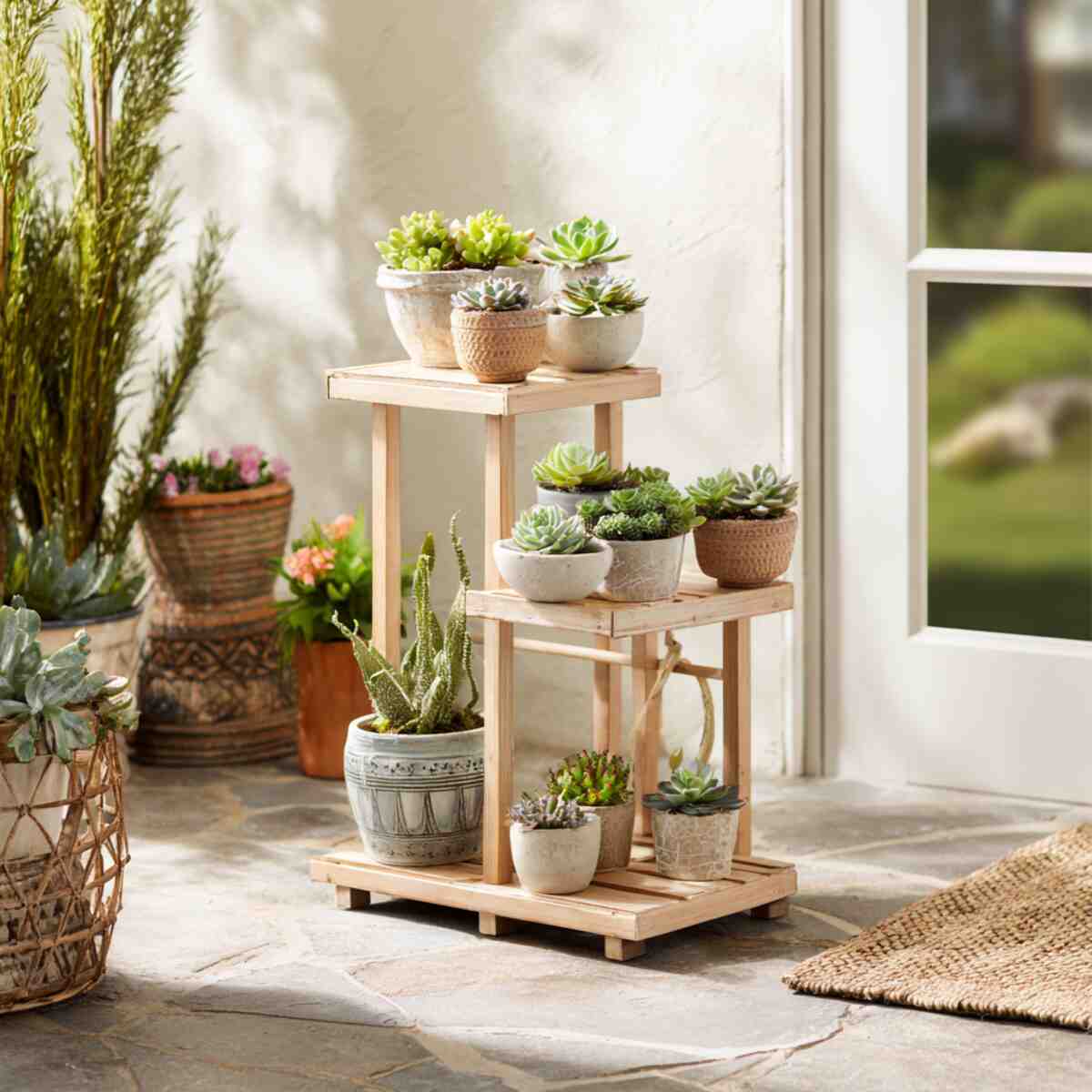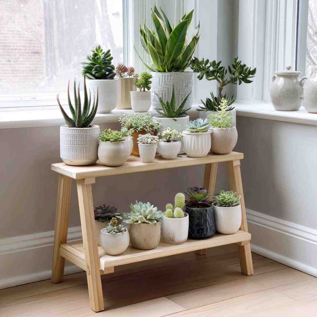 A simple wooden step stool can double as a plant stand for two or three pots. It’s portable and gives your display a casual, layered look.