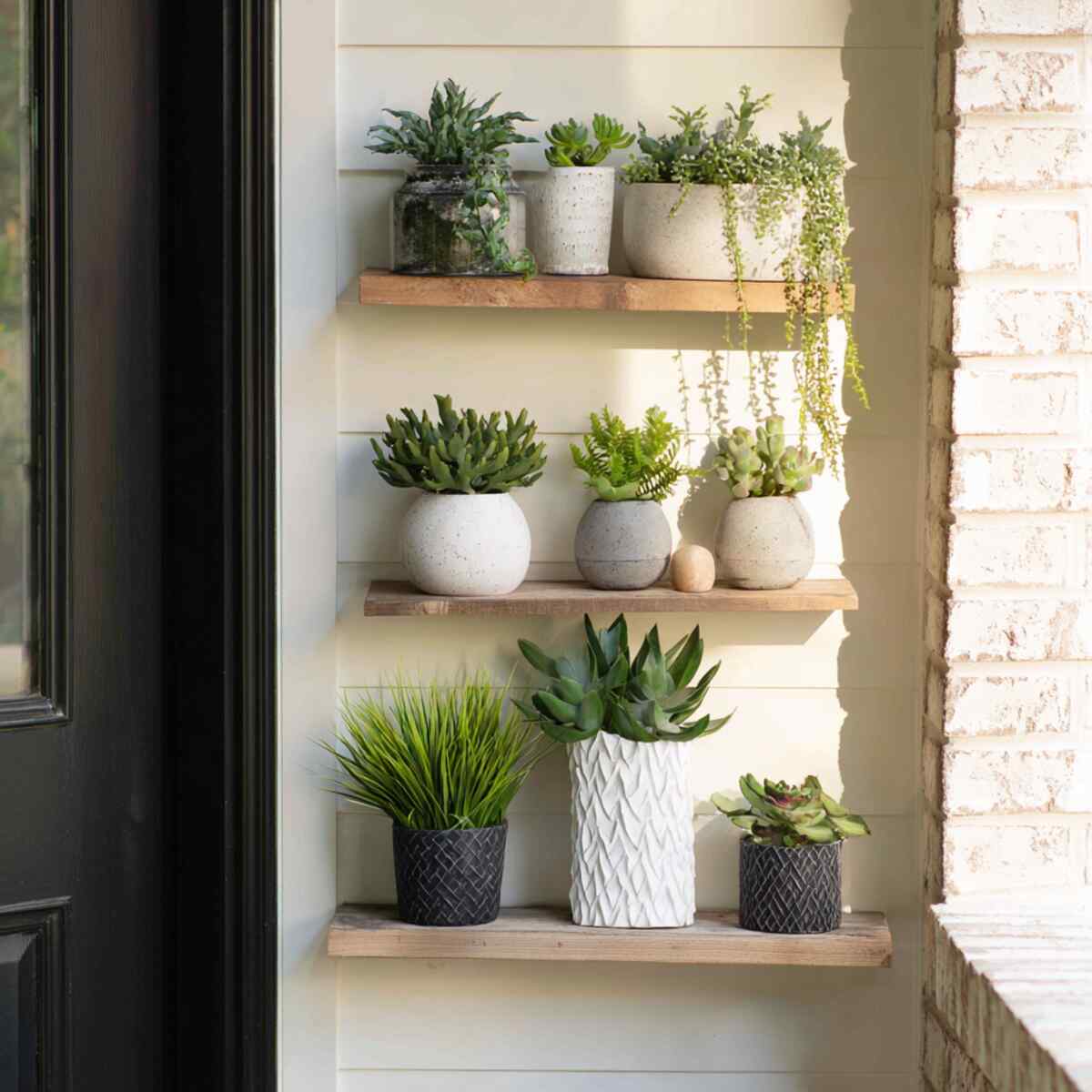 Installing floating shelves along a porch wall creates extra space for small pots or trailing plants.
