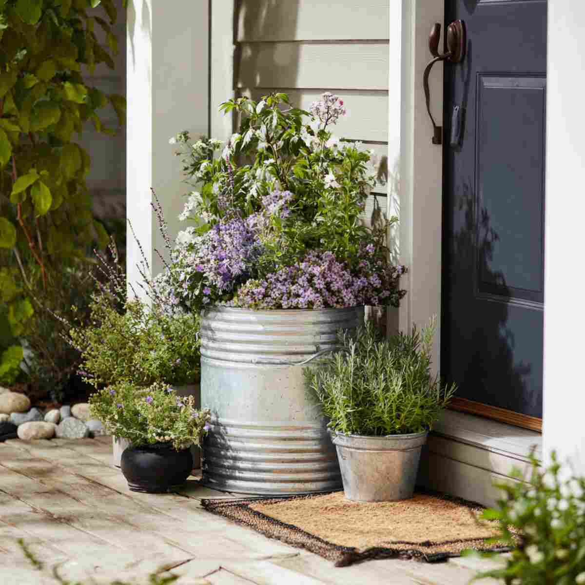 Using galvanized buckets as planters adds a farmhouse touch to your porch. They’re durable, weather-friendly, and easy to move around when needed.