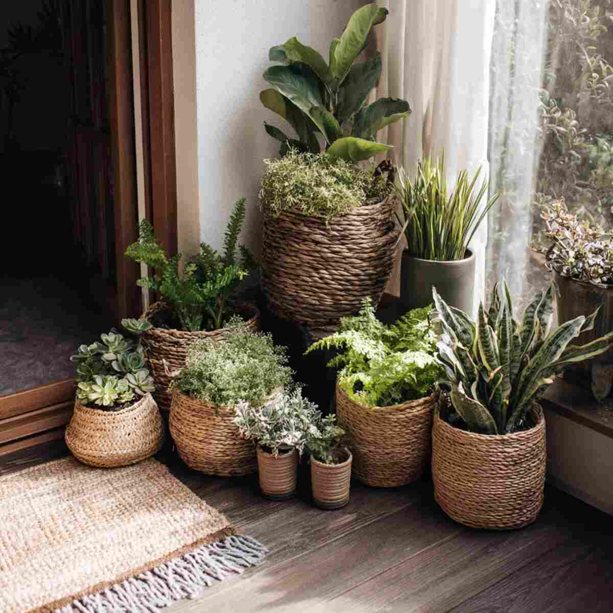 Grouping woven baskets filled with plants creates a cozy and natural look. You can vary basket sizes for depth and texture.