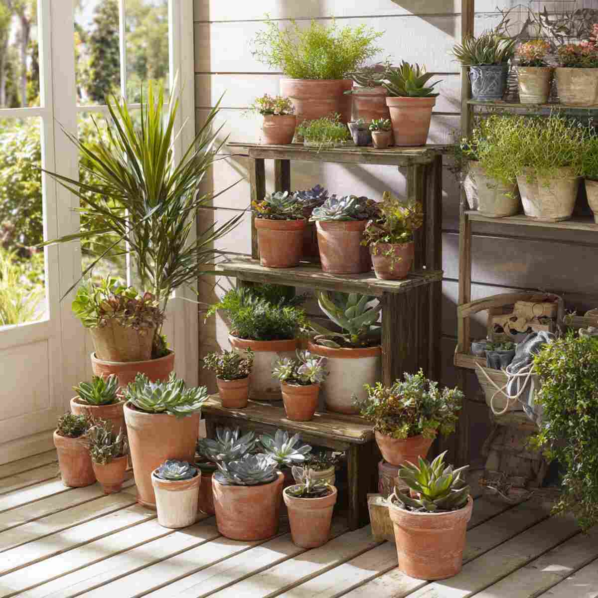 Stacking clay pots in a tower shape is a fun and artistic way to show off plants. It adds height and can be adjusted to fit any small porch corner.