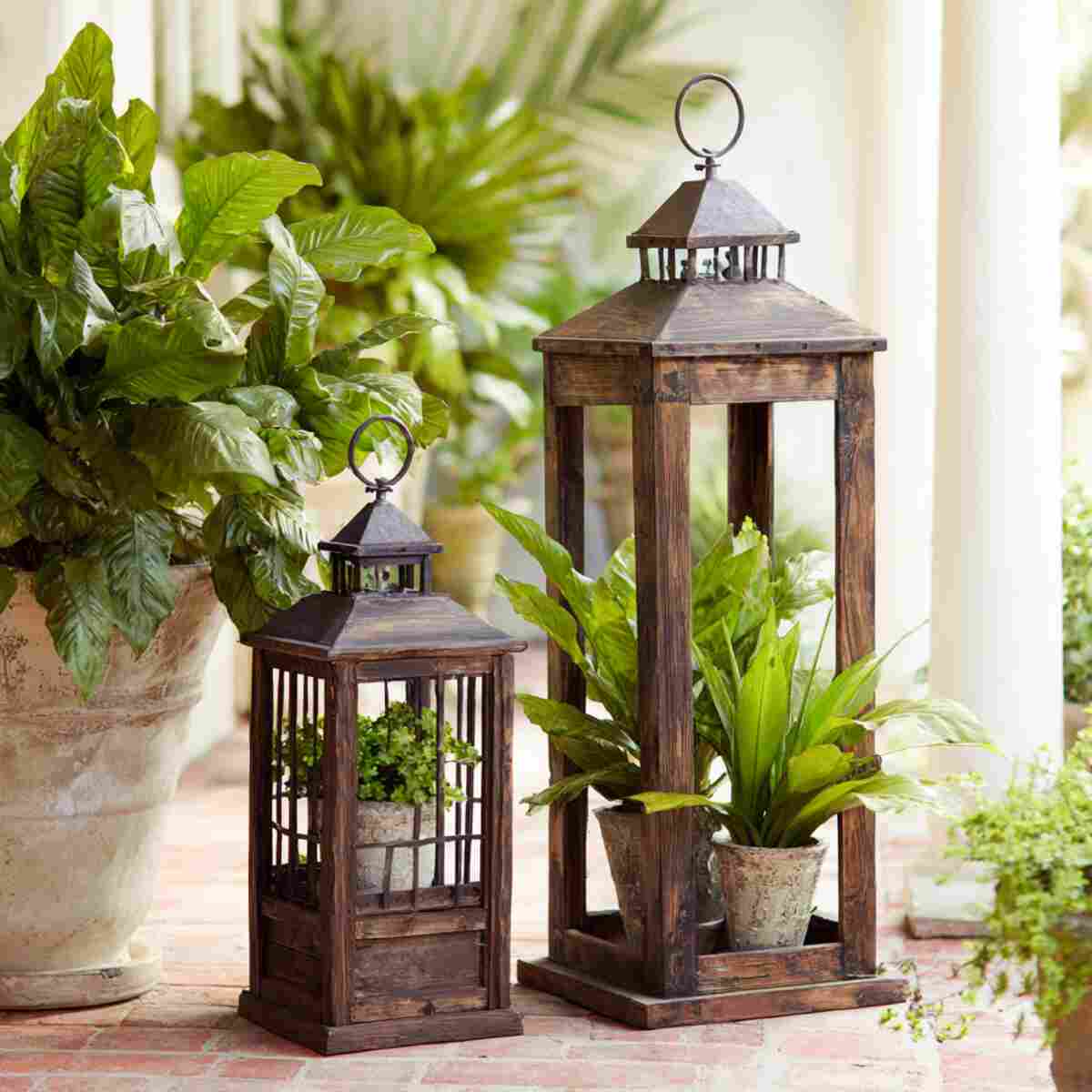 Decorative lanterns can be repurposed to hold small potted plants or candles surrounded by greenery.