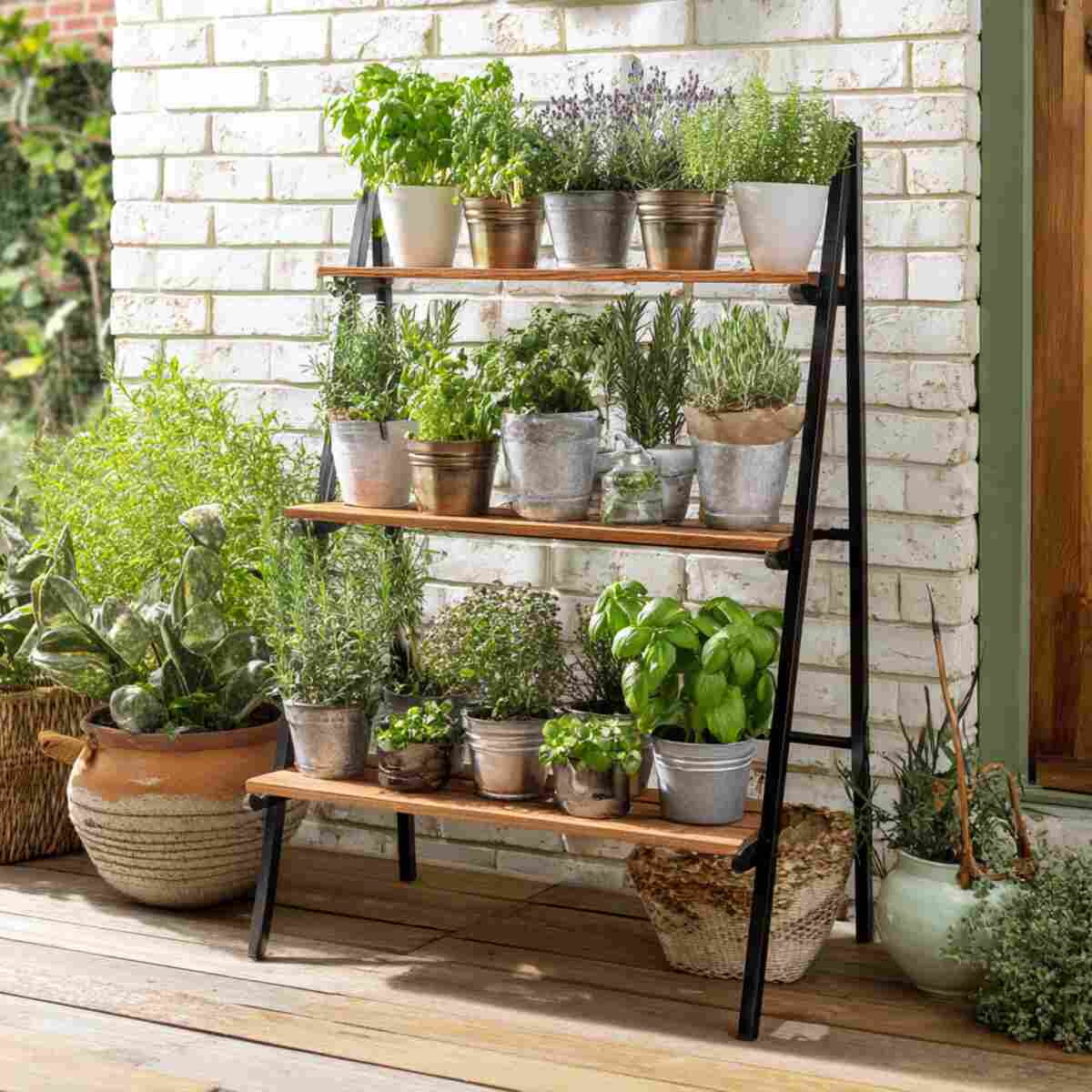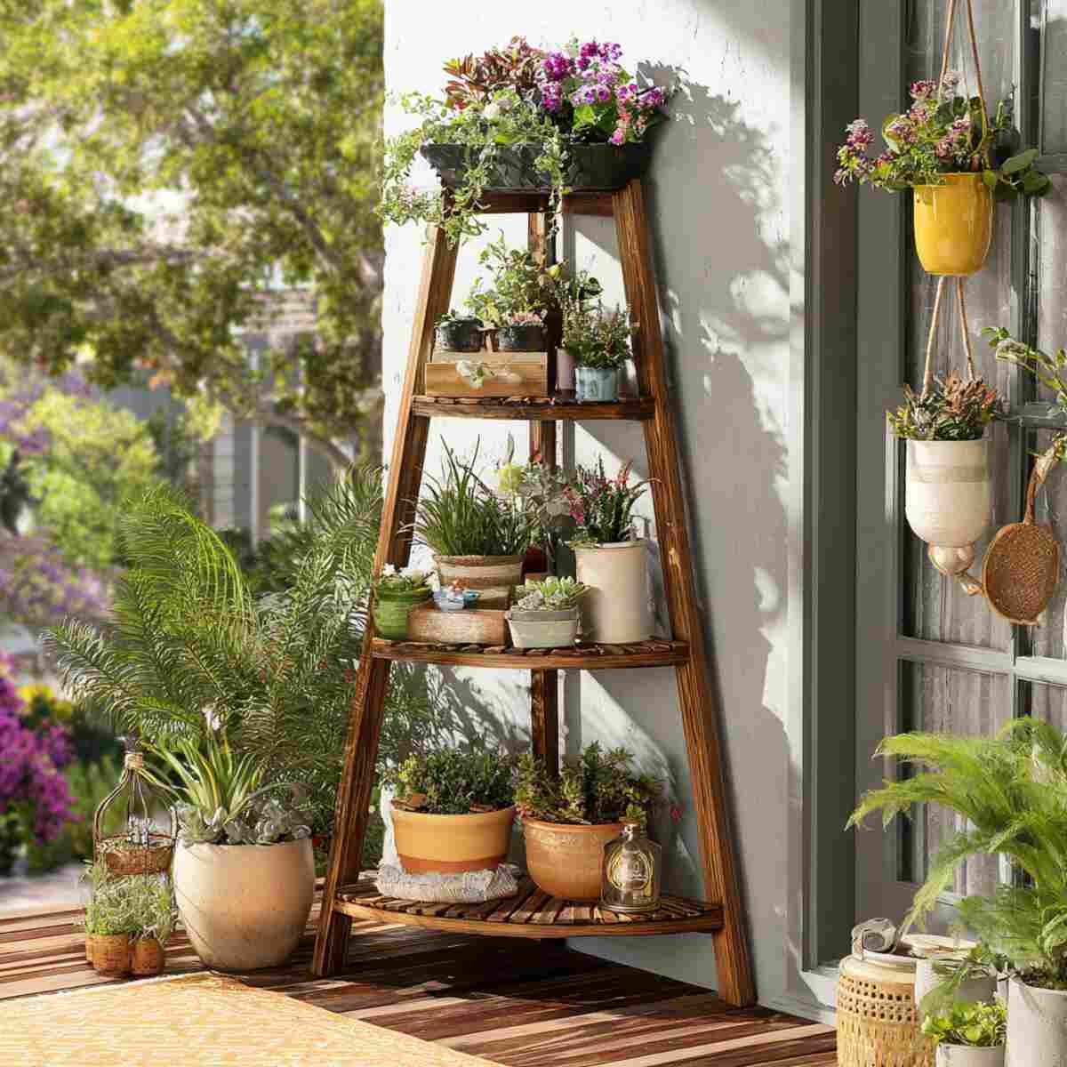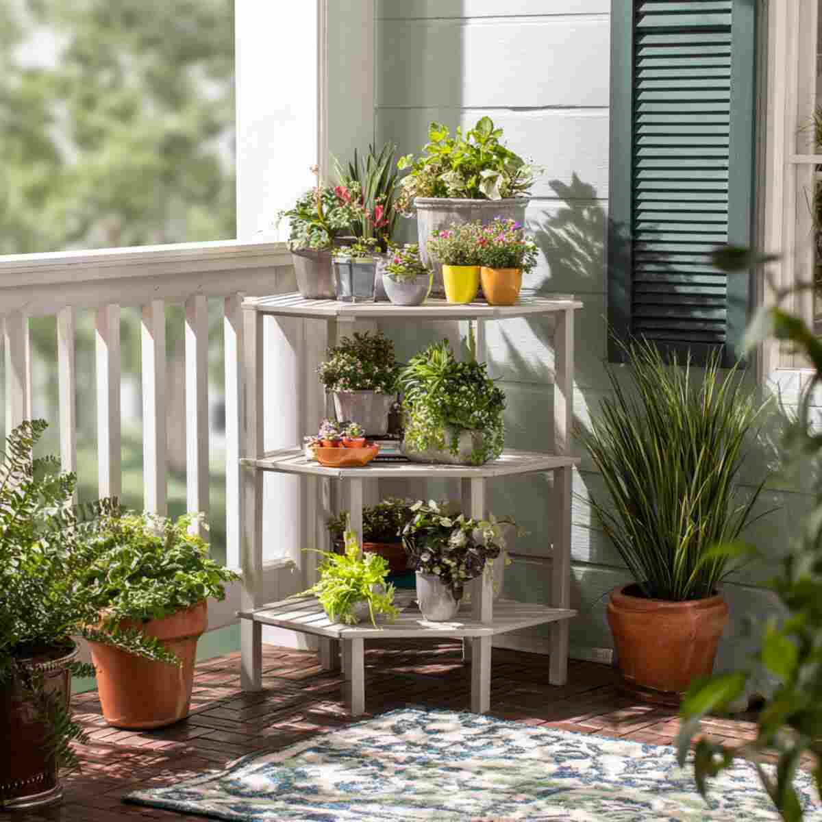 A corner ladder shelf fits neatly in unused porch corners and provides several levels for potted plants.