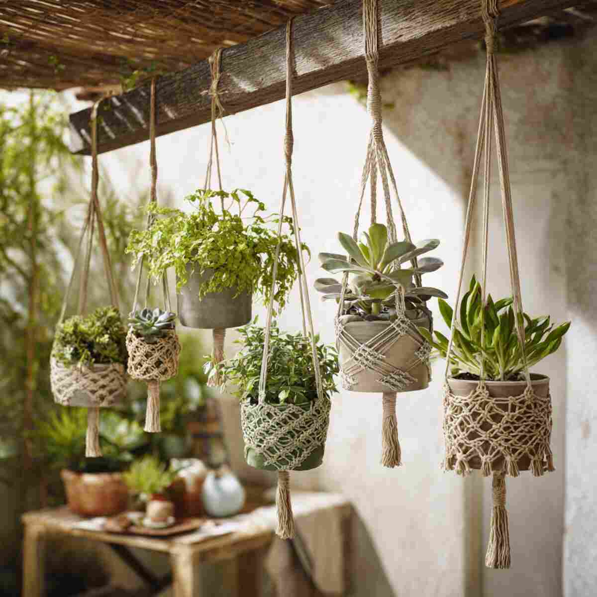 Macramé hangers bring an artistic and boho touch to a small porch. You can hang several pots at various lengths for a floating garden effect.