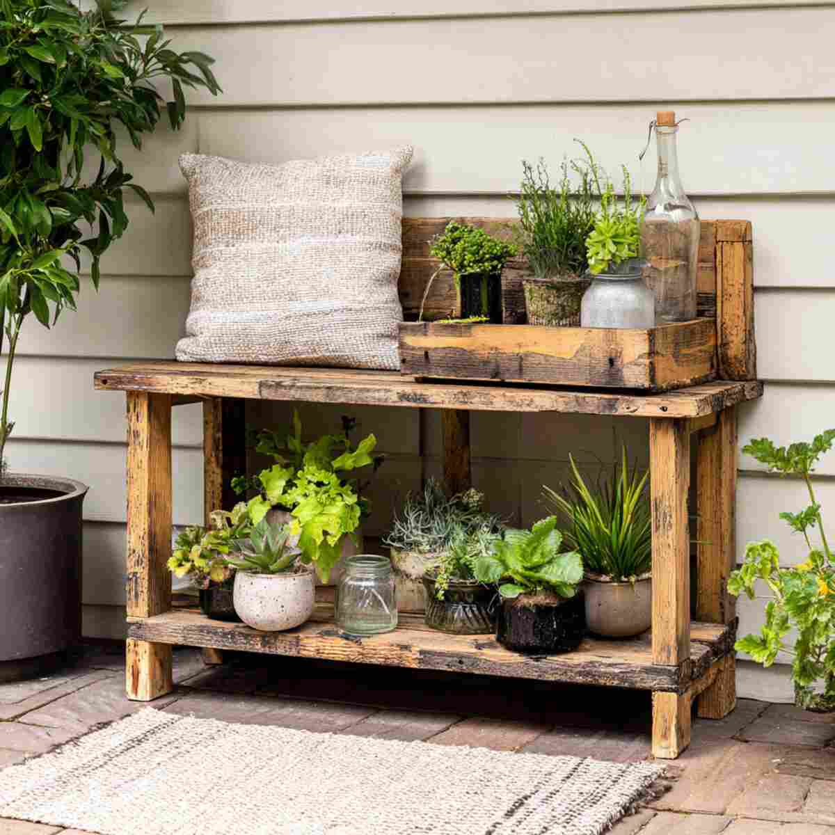 A reclaimed wood bench provides both seating and plant display space. You can place plants underneath or along the top for a natural, rustic charm.
