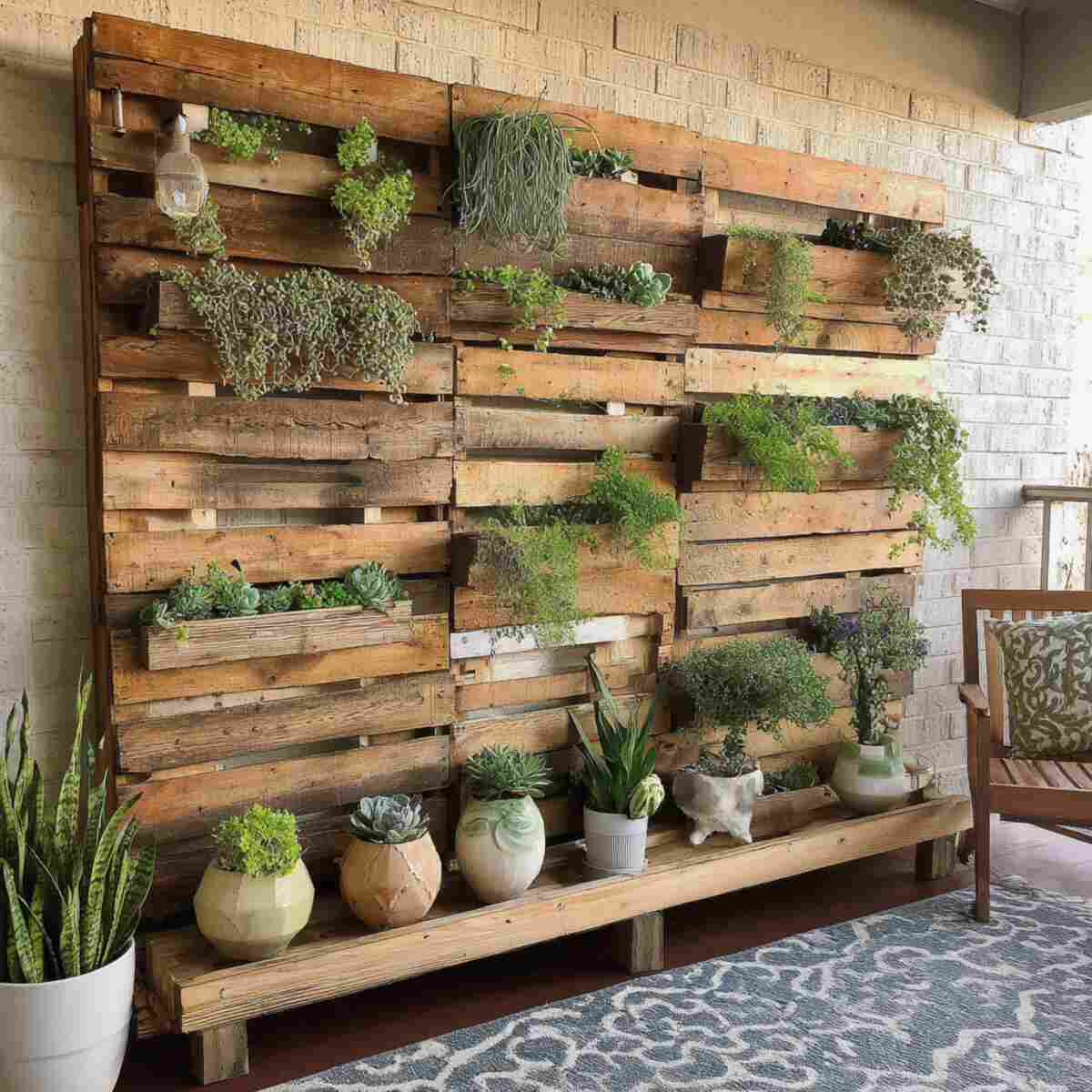 Repurposing a wooden pallet into a vertical planter is a stylish and eco-friendly way to decorate your porch.