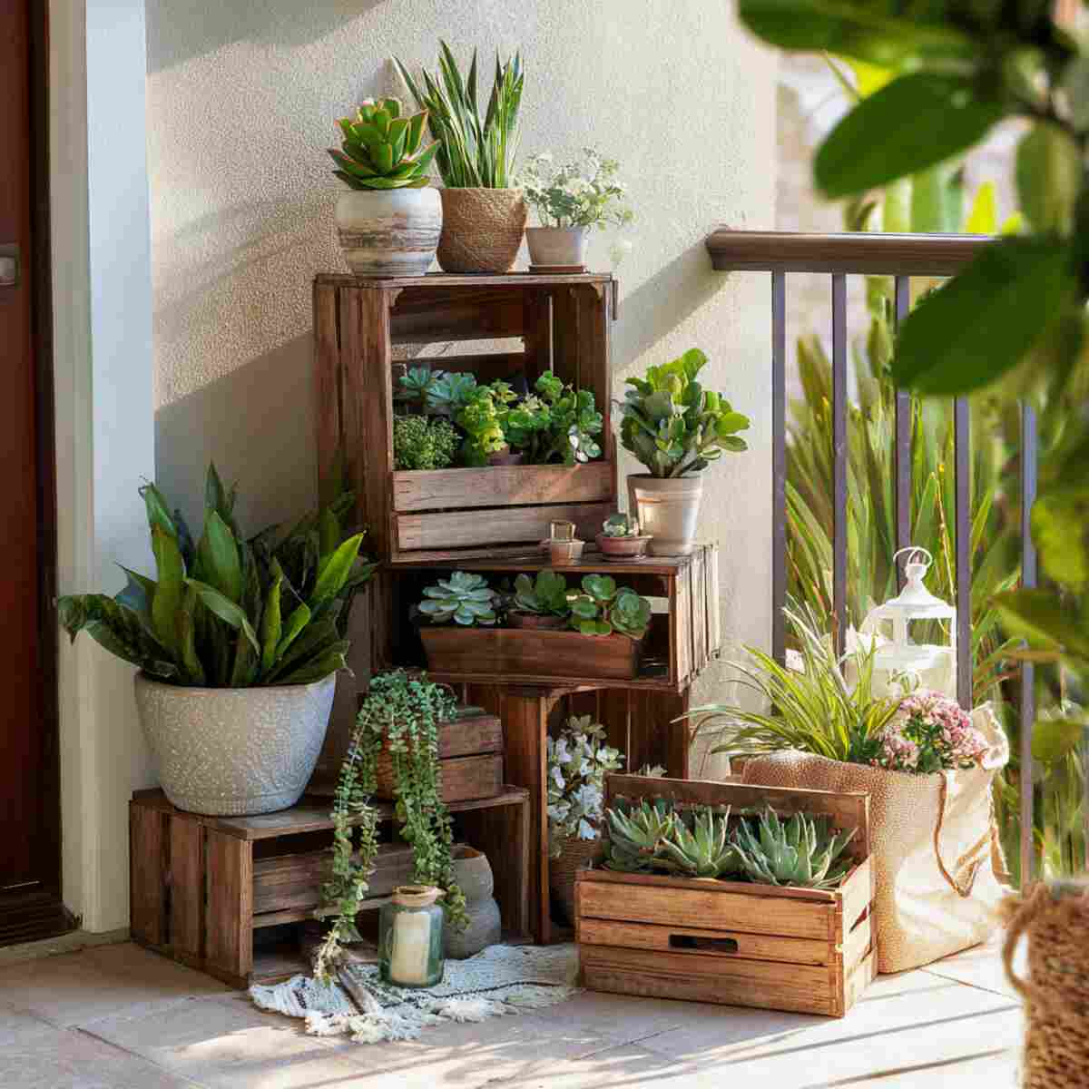 Each crate can hold different plant sizes or types for variety. This Small Porch Plant Display Idea adds storage and visual interest while staying space-efficient.