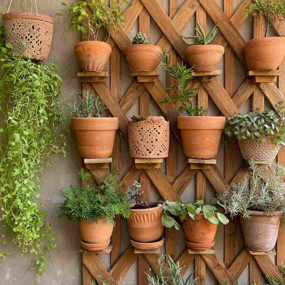 You can attach small pots or plant herbs directly in the slots. This Small Porch Plant Display Idea transforms empty wall space into a lush green focal point.