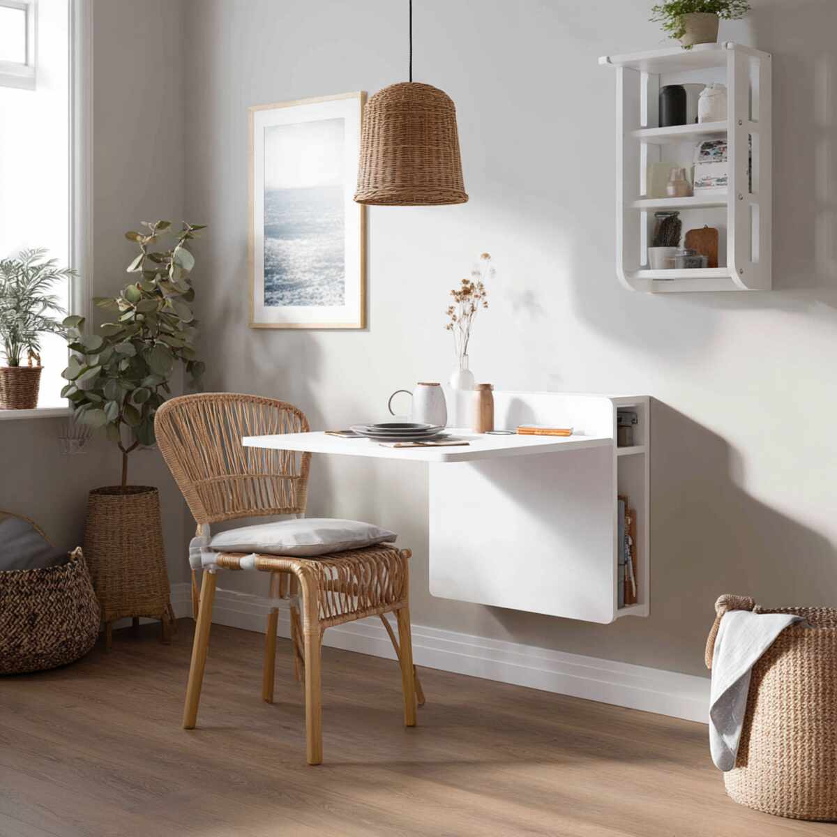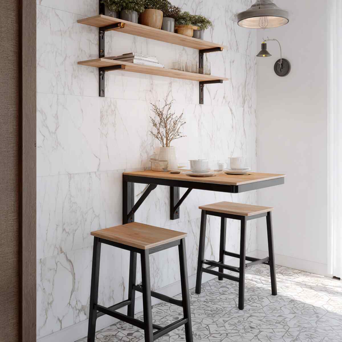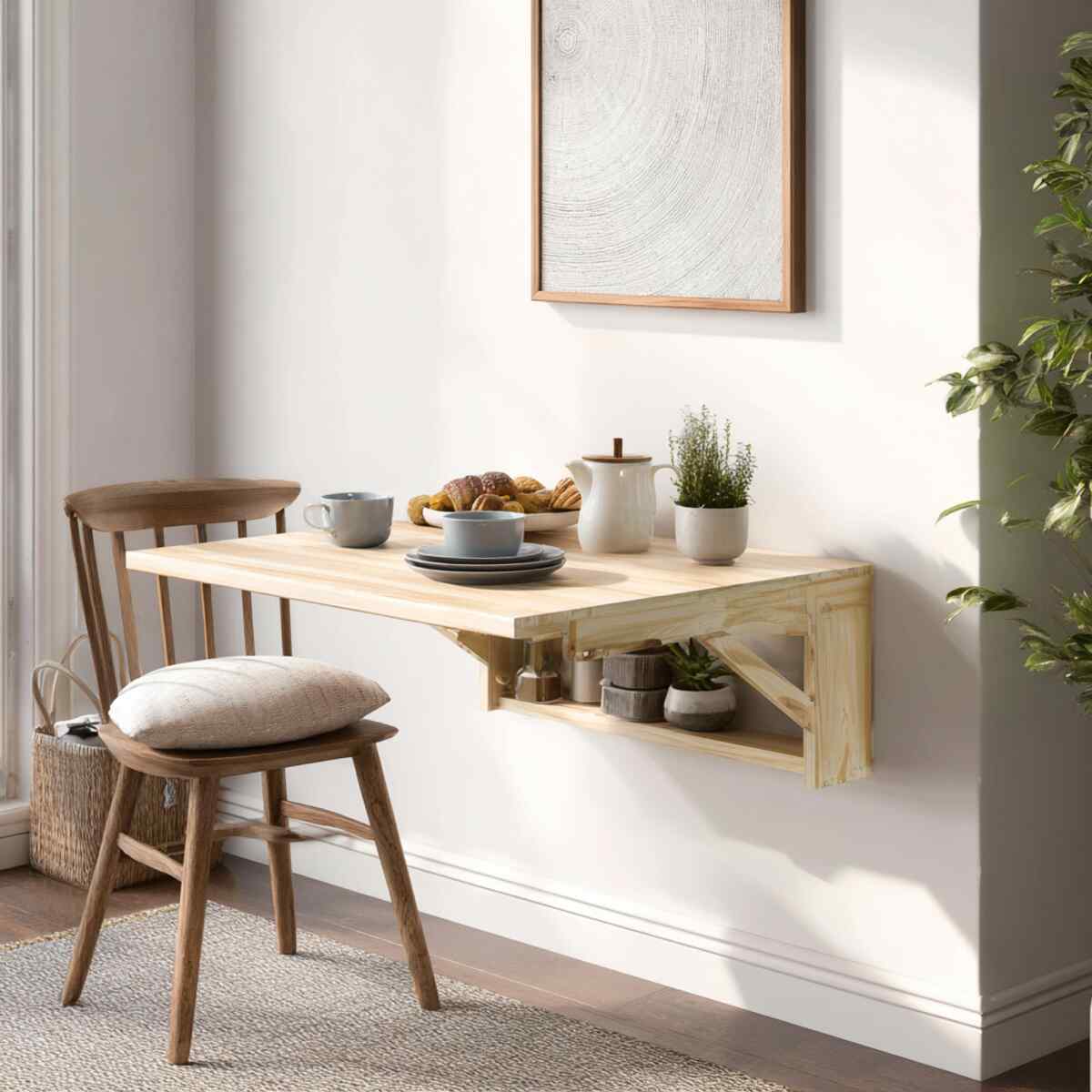 A fold-down wall table is one of the smartest small space dining zone ideas because it saves floor space when not in use.