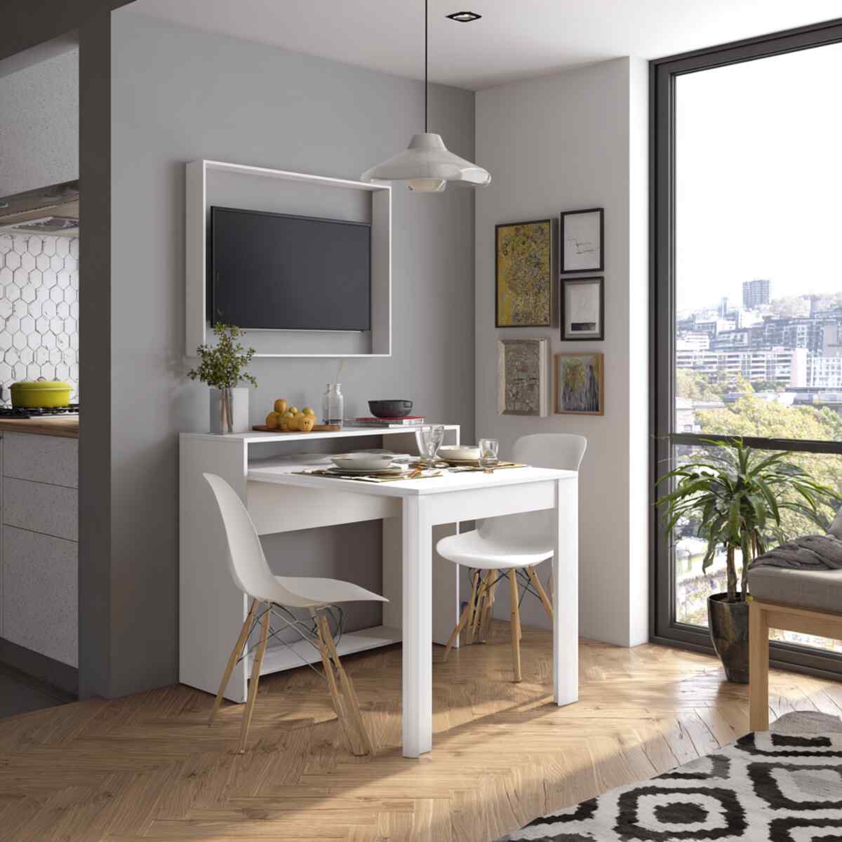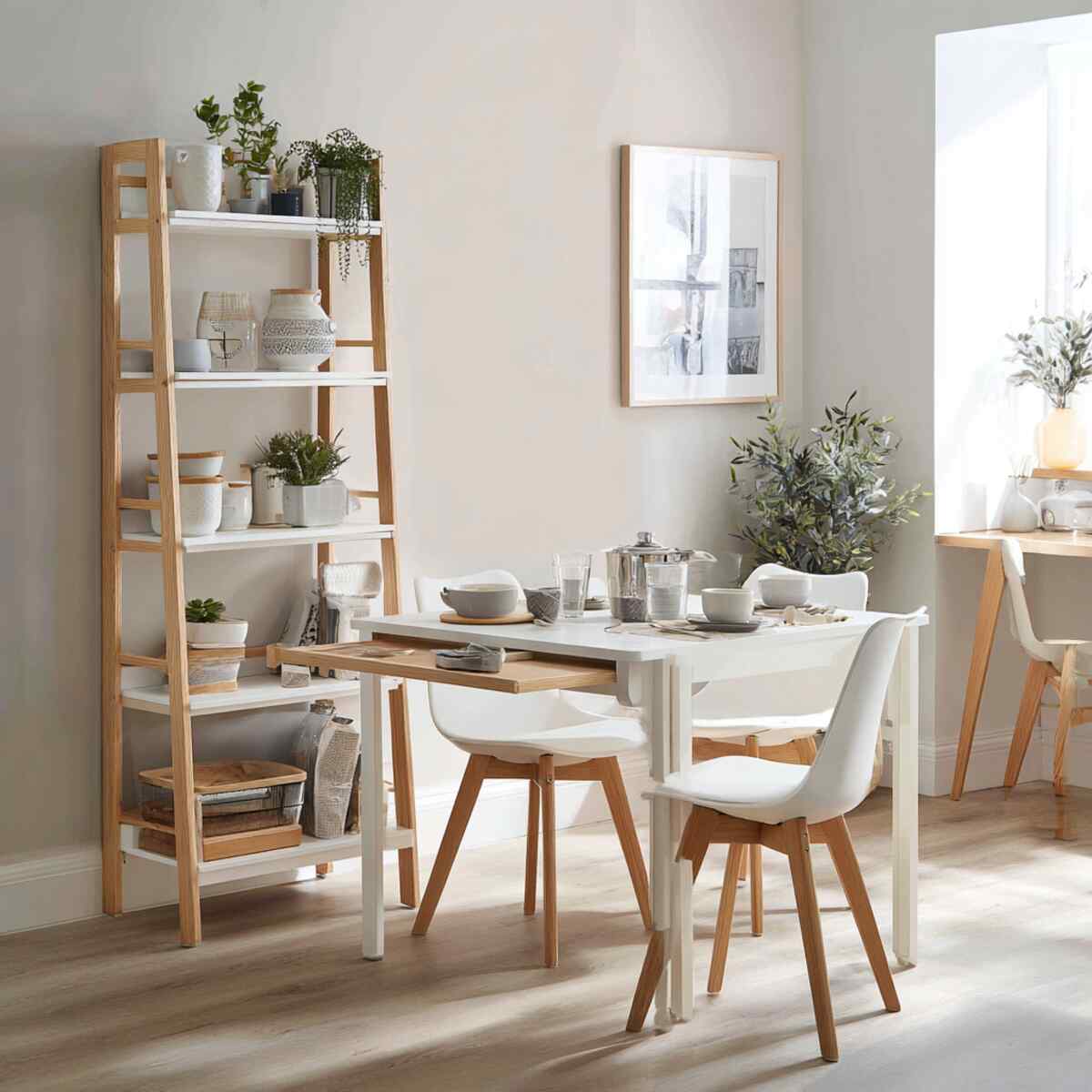 It offers both vertical storage and a small eating zone. This small space dining zone idea is especially practical for compact apartments.