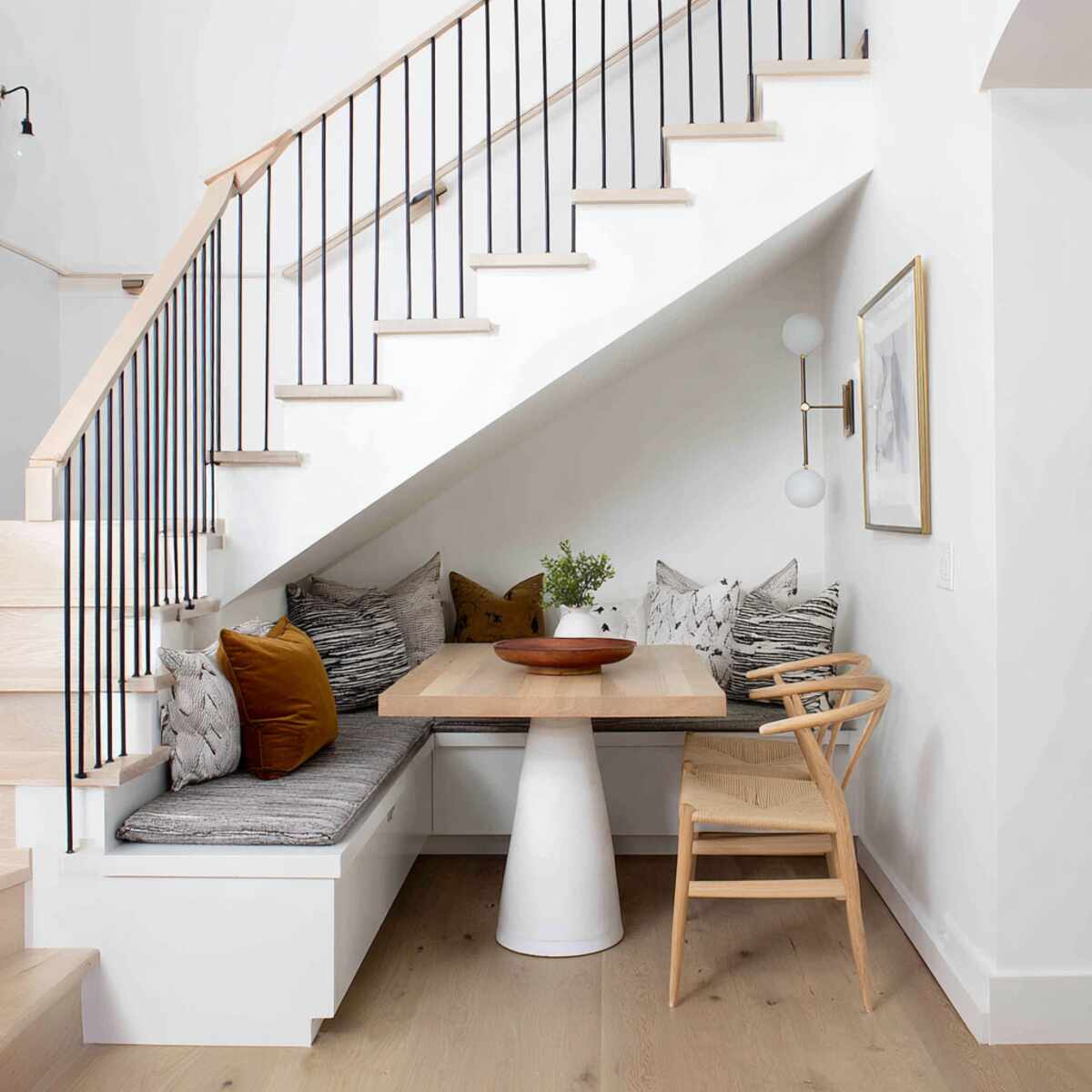 The area under stairs often goes unused, but it can house a dining nook. A compact table with built-in seating makes it functional.