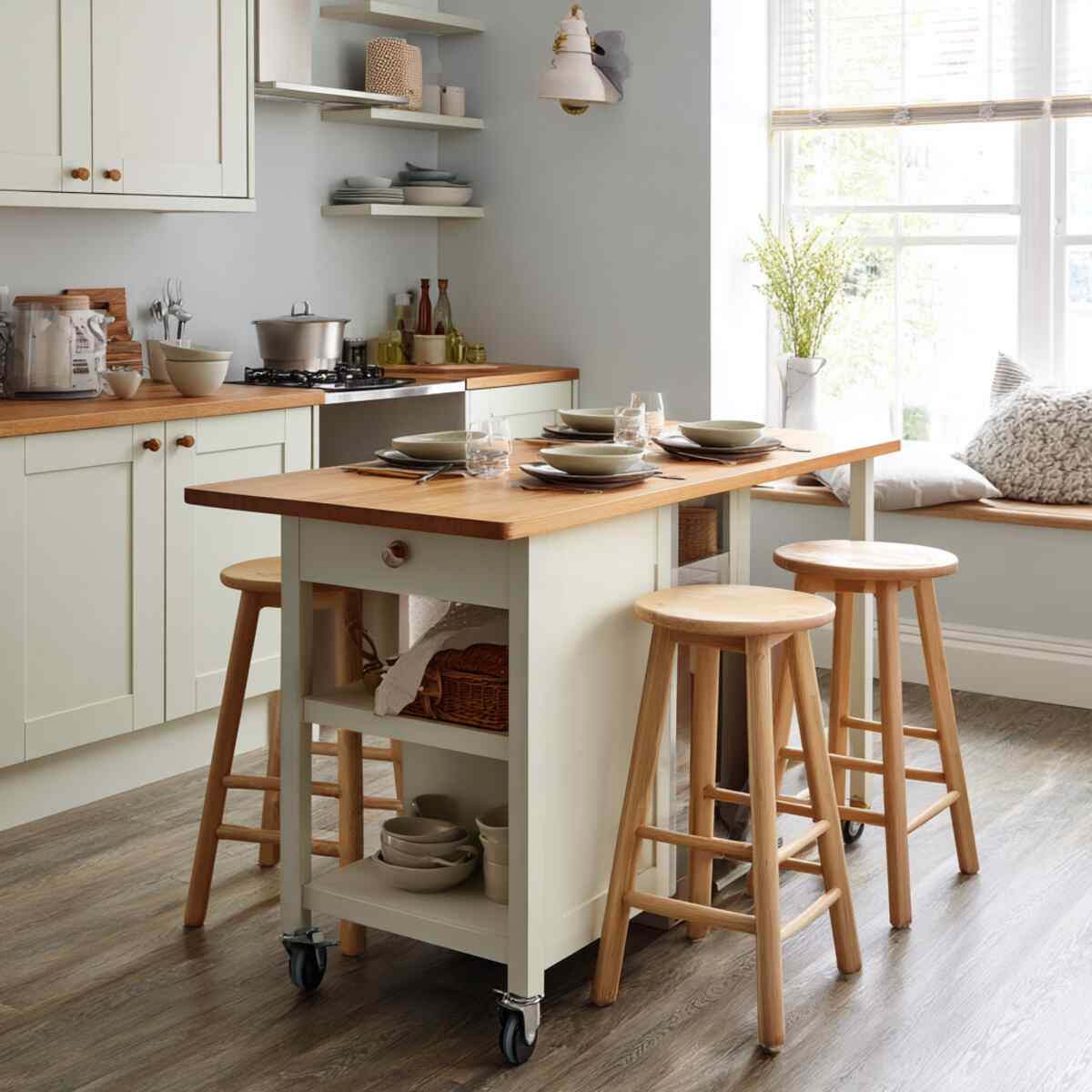 A rolling kitchen island doubles as a dining area when paired with stools. It can be moved around and tucked away when not in use.