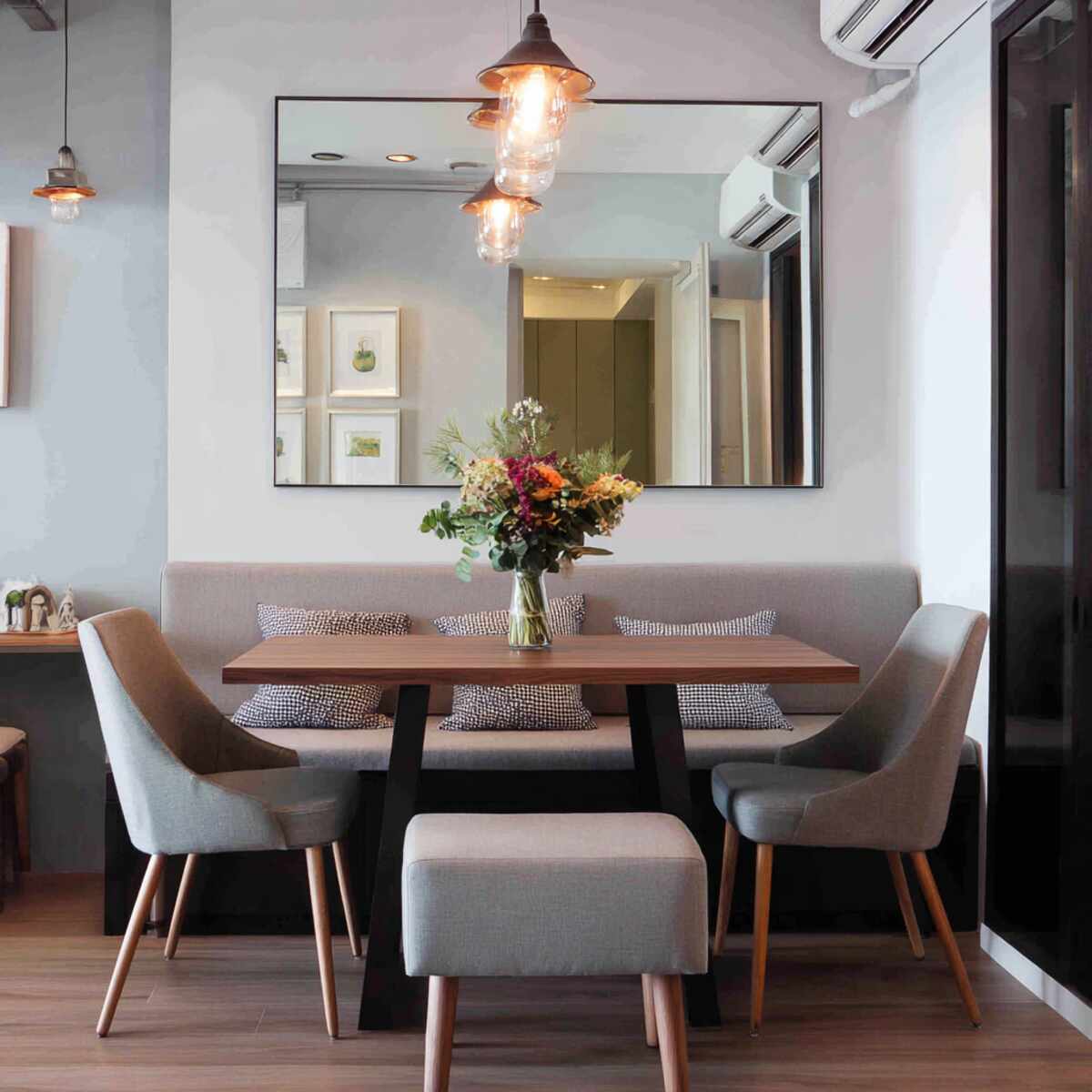 Adding a mirrored wall near the dining zone makes the area look bigger. It reflects light and creates the illusion of depth.