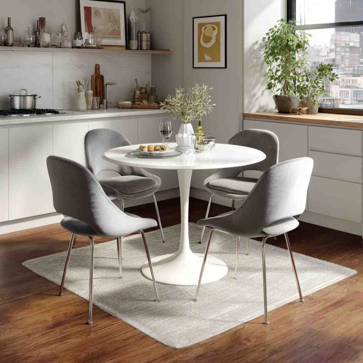 A round pedestal table works well in tight areas because it doesn’t have bulky legs. It creates an open flow, allowing chairs to tuck in neatly.