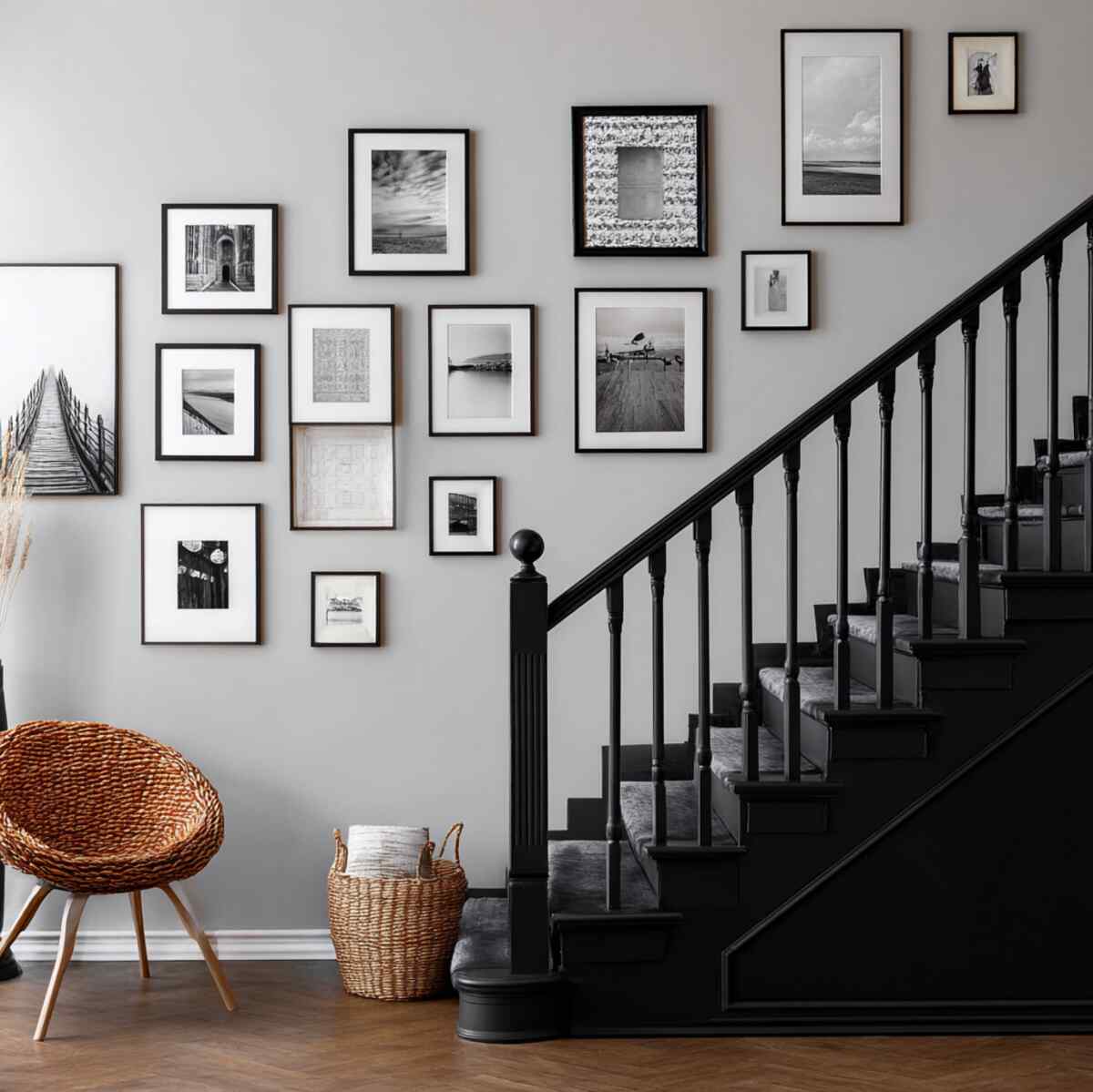 A black-and-white theme creates a calm and unified look, making it a popular choice among Staircase Art Frame Arrangement Ideas.