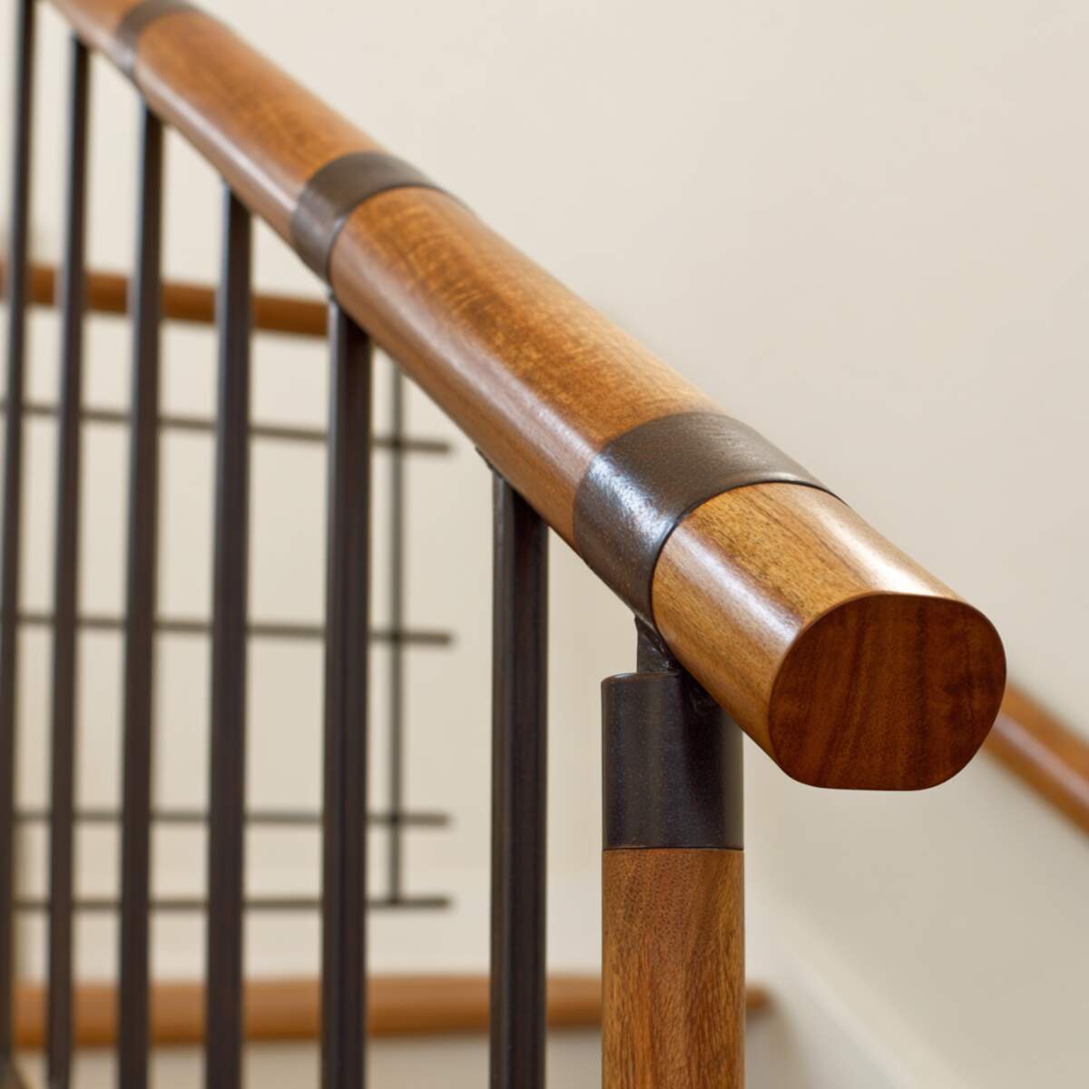 Mixed material handrails combine wood and metal to create a stylish contrast that suits modern and transitional interiors.