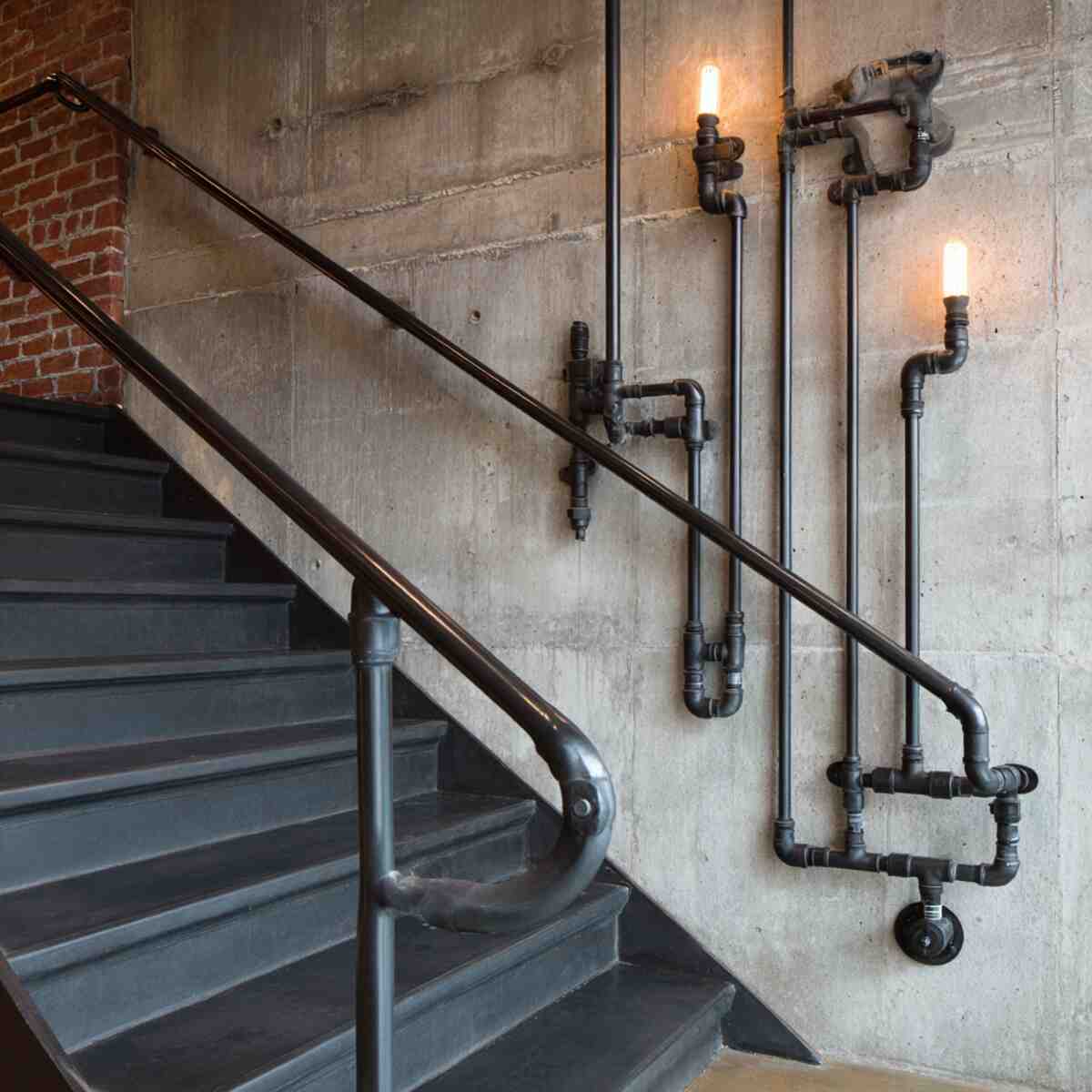 Industrial pipe handrails use metal piping to create a raw, utilitarian aesthetic that fits loft-style or modern industrial homes.