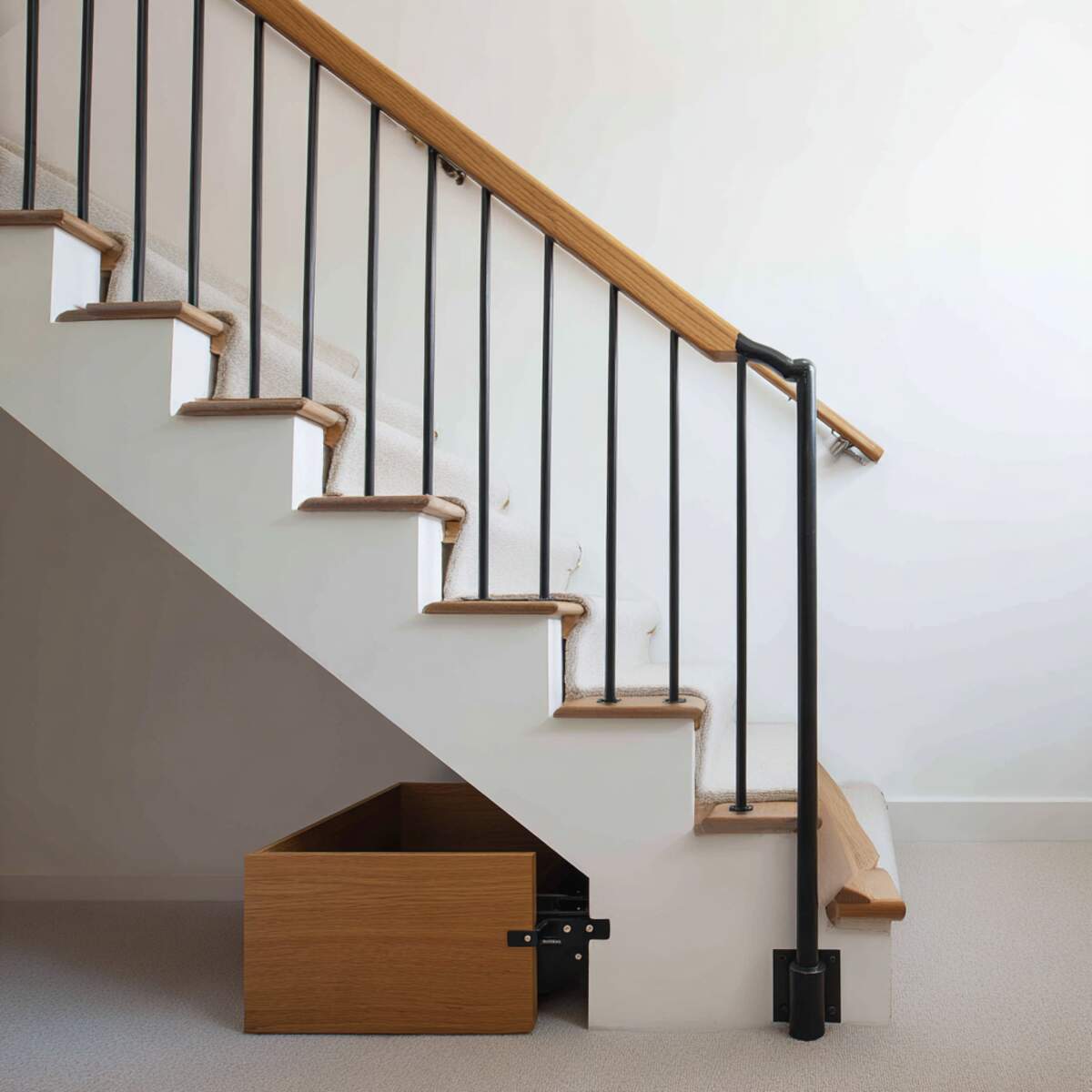 Handrails with built-in storage maximize functionality by integrating shelves, drawers, or compartments along the staircase.