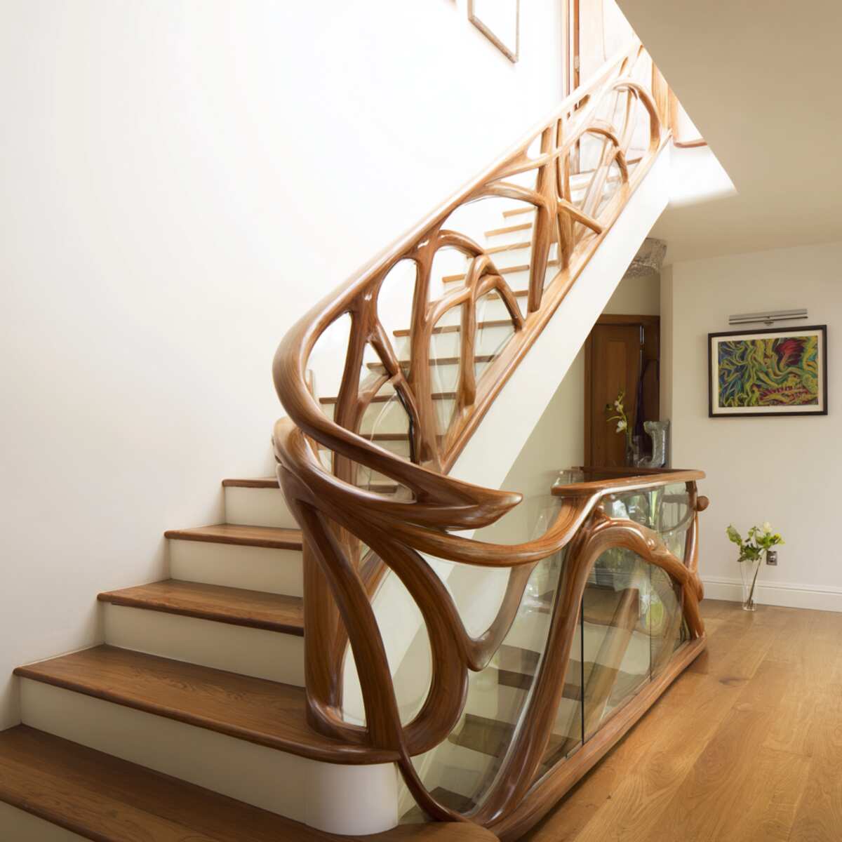 Artistic sculptural handrails act as both functional support and a statement piece, turning the staircase into an art installation.