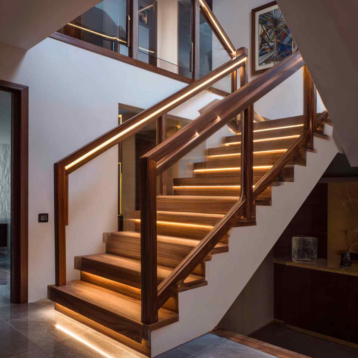 Wooden handrails with integrated LED lighting add warmth and ambiance to staircases while enhancing visibility at night.