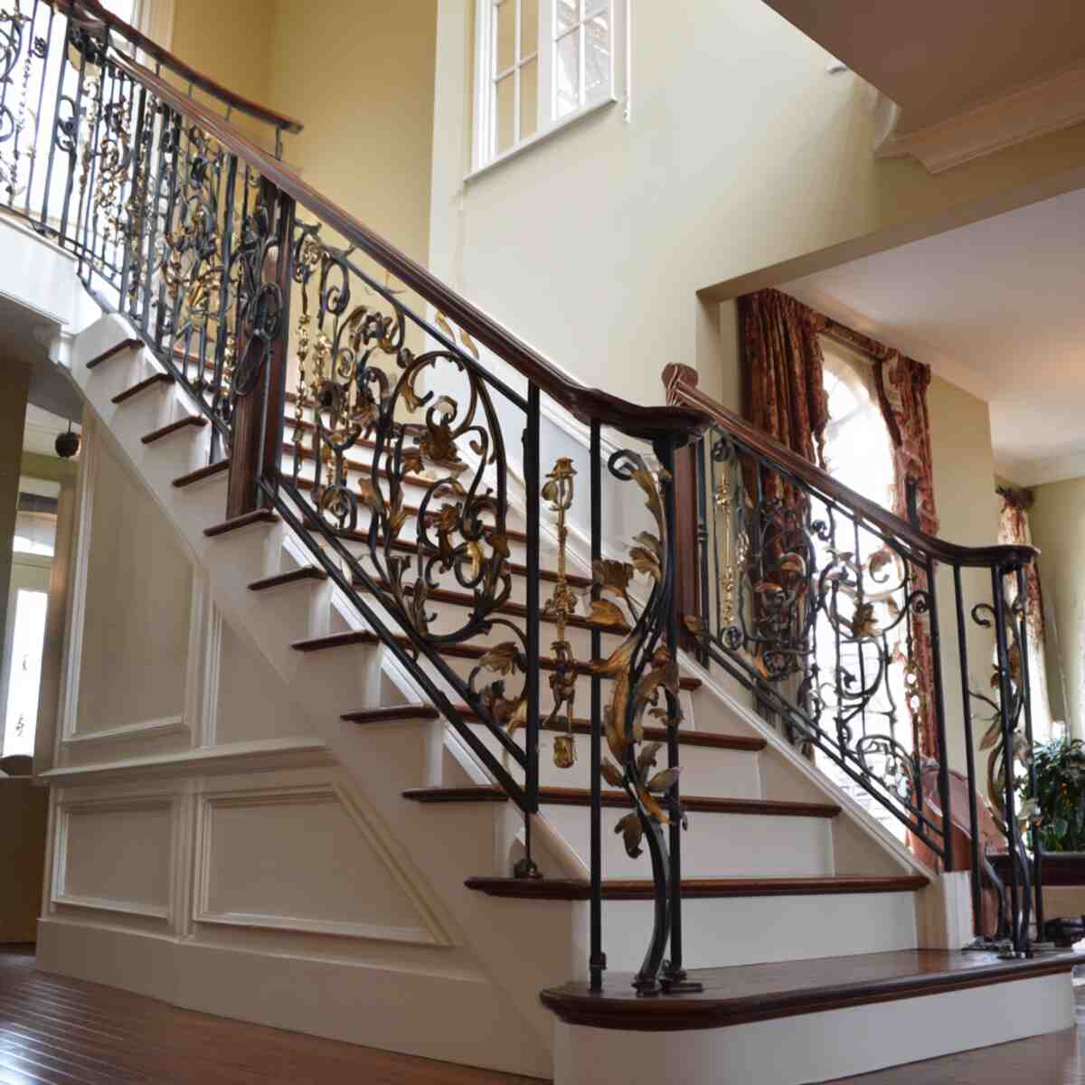 Wrought iron decorative handrails bring a touch of elegance and intricate artistry to any staircase. They are essential Staircase Handrail Design Ideas for homes that want a classic or vintage aesthetic.