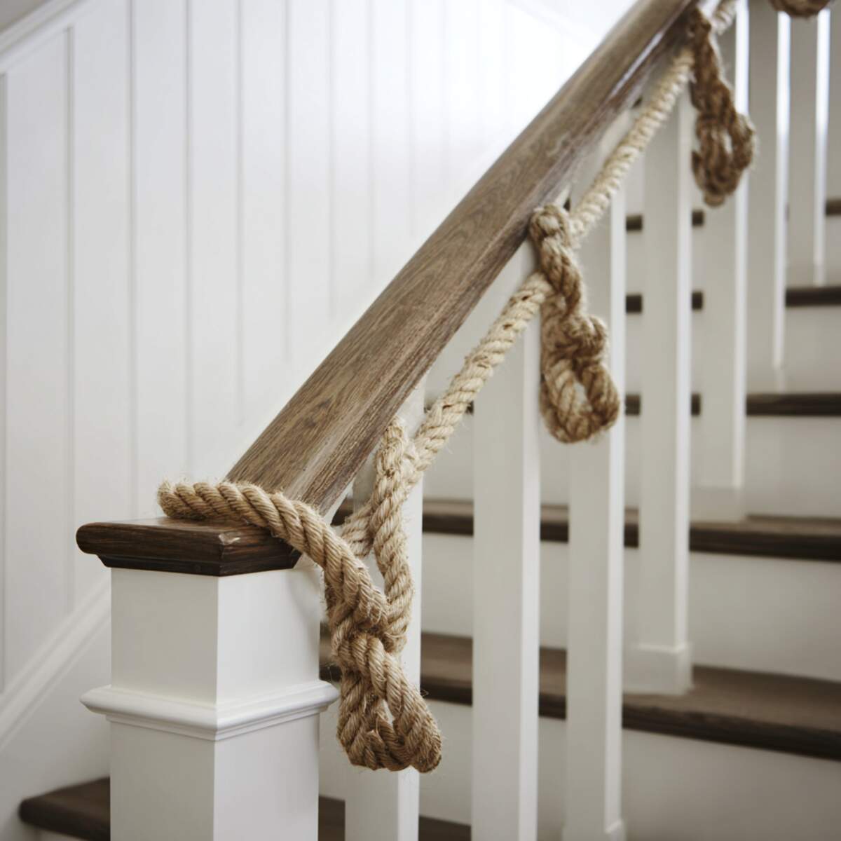Rope handrails add a casual, nautical, or rustic touch to staircases, making them both decorative and functional.