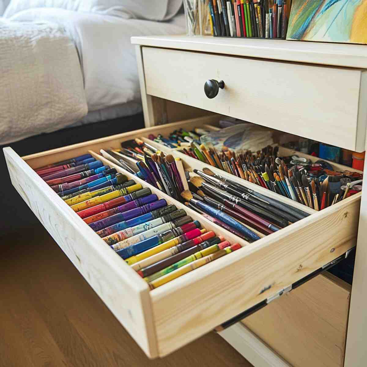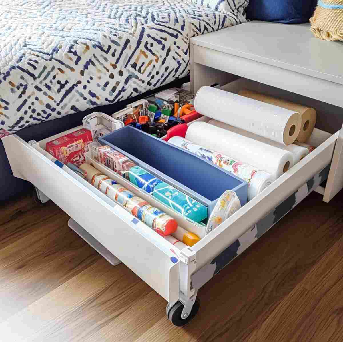 An art supply tray on wheels makes it simple to store paints, brushes, sketchbooks, and other materials. These Under Bed Rolling Storage Ideas help artists stay organized without cluttering desks or shelves.