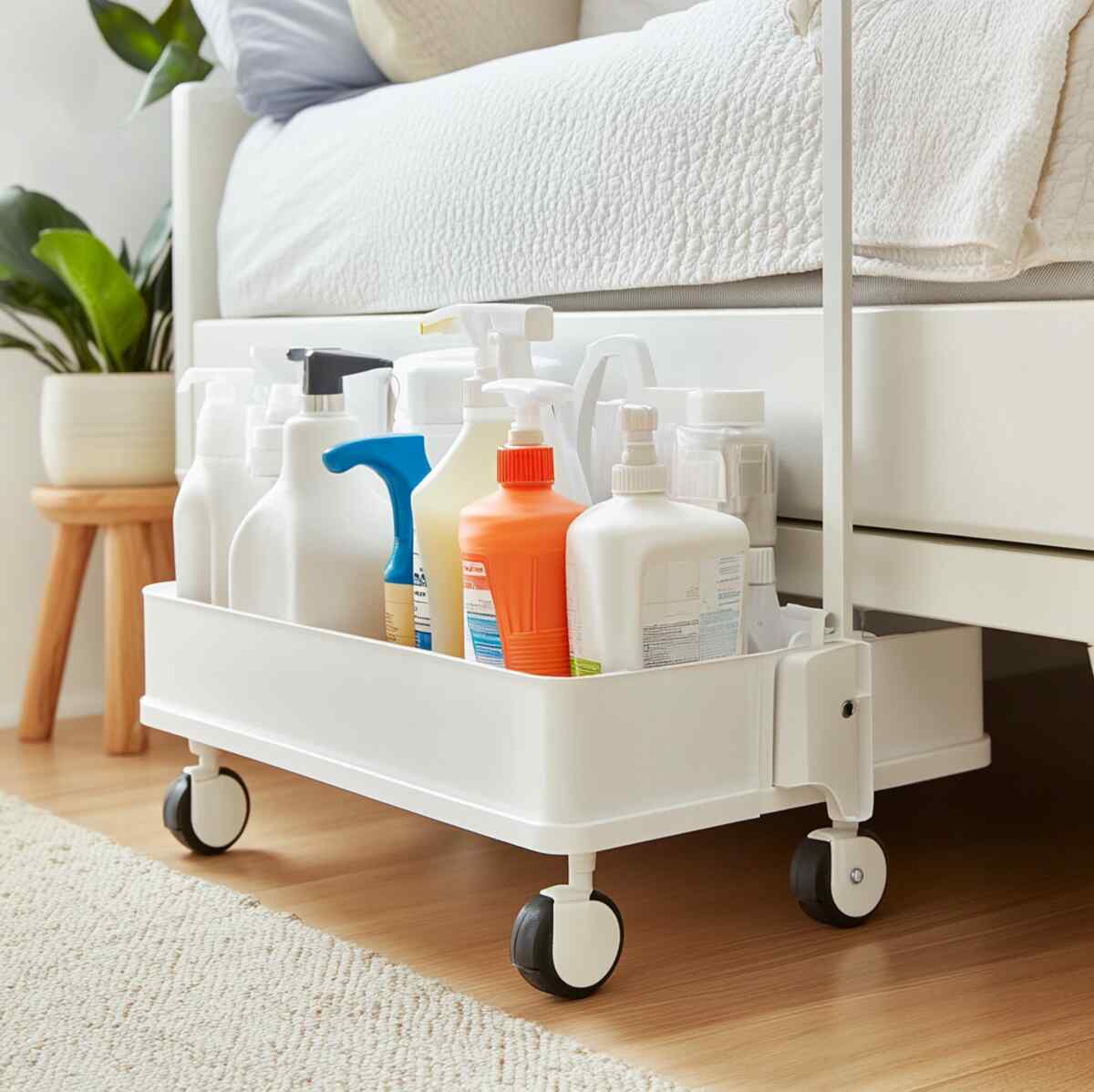 A rolling caddy under the bed is perfect for storing wipes, sprays, cloths, and extra cleaning tools.