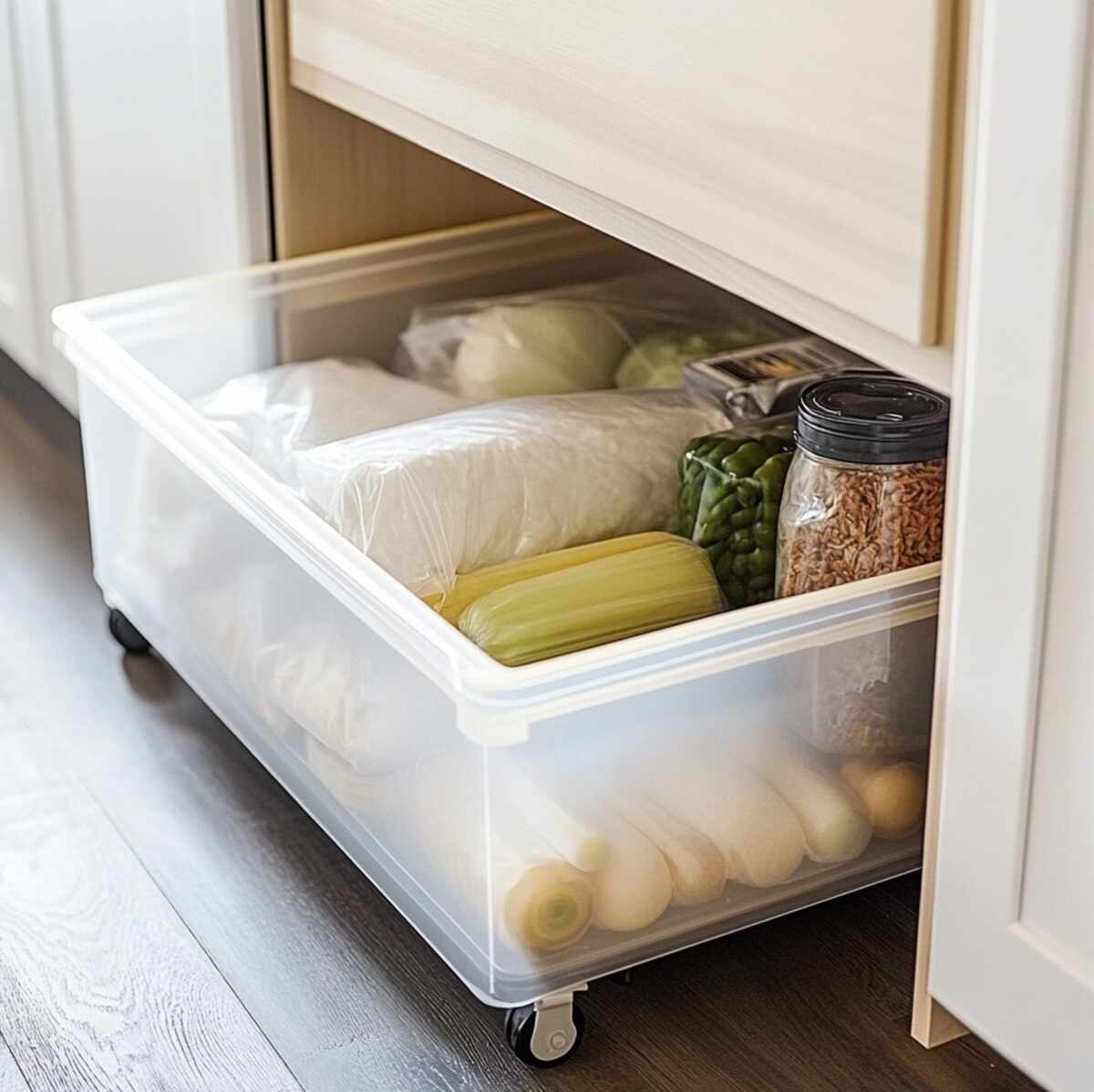 A rolling pantry bin provides extra space for snacks, packs, or rarely used kitchen items if you’re short on cabinet room.