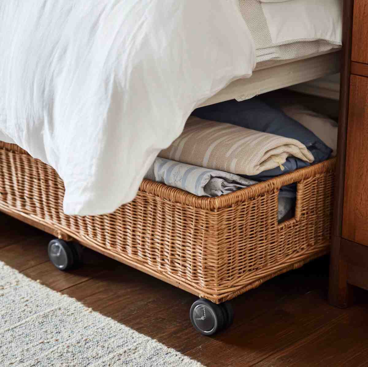 A wheeled wicker basket adds natural warmth to your bedroom décor while staying functional. As an addition to Under Bed Rolling Storage Ideas, it stores blankets, toys, or extra pillows in a breathable container.