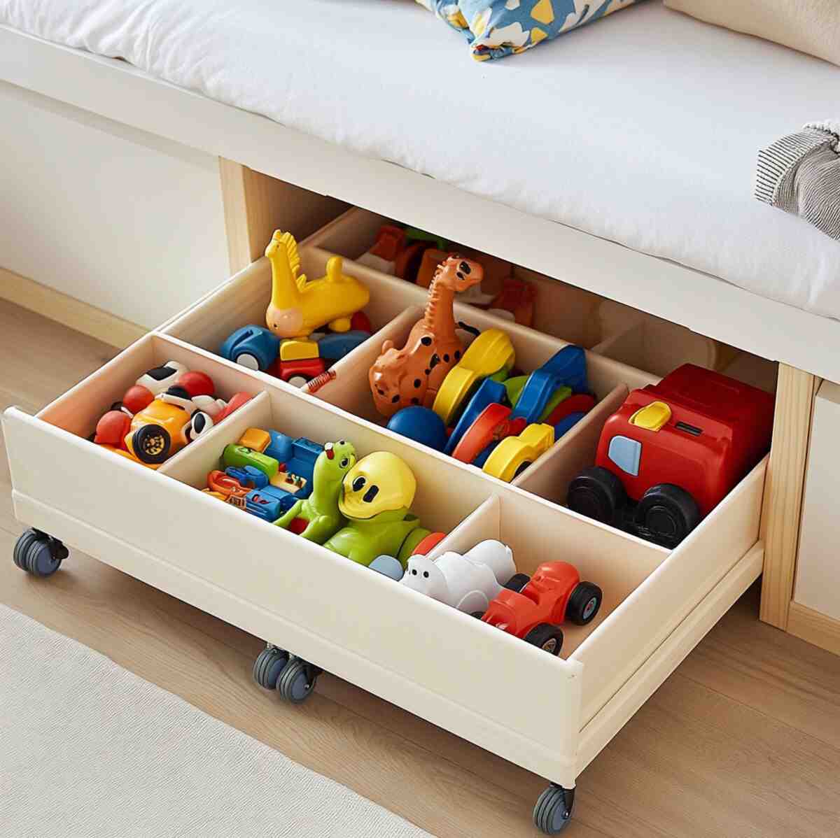 These Under Bed Rolling Storage Ideas allow children to pull out their toys quickly and push the bin back afterward. It teaches simple organizing habits while saving floor space and maintaining a tidy look.