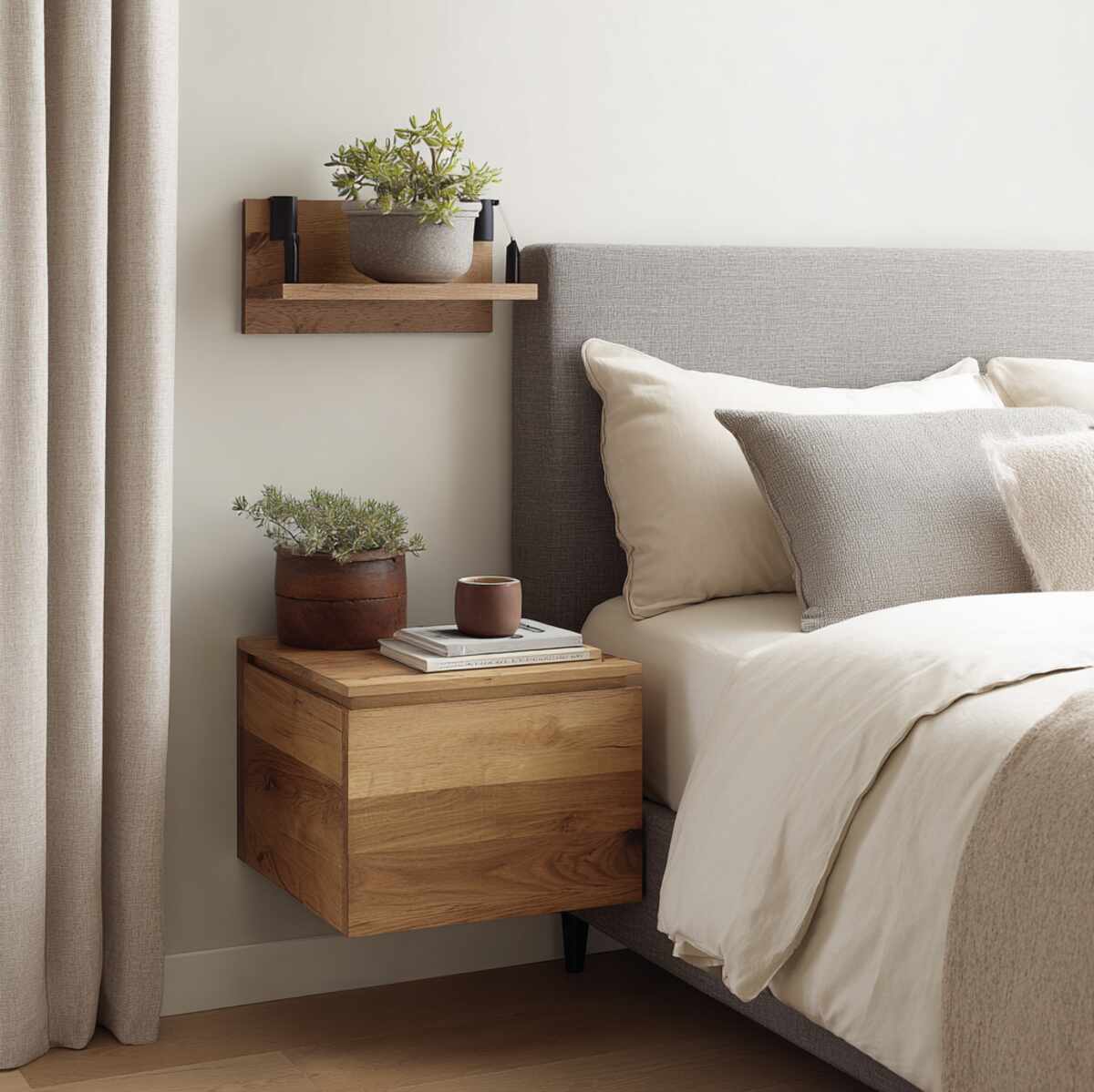 Hidden storage makes this one of the smartest wall-mounted nightstand ideas for clutter-free bedrooms.