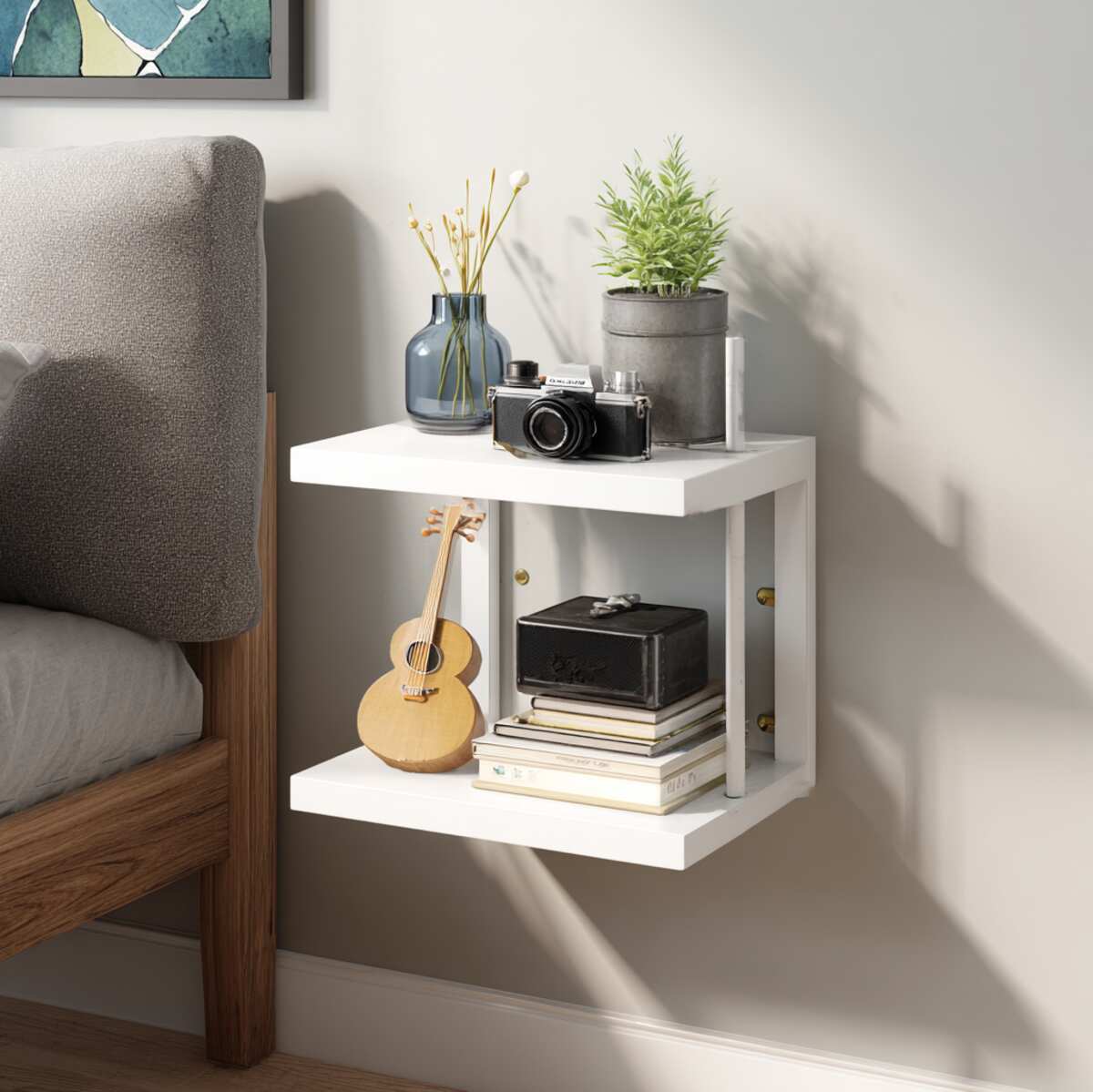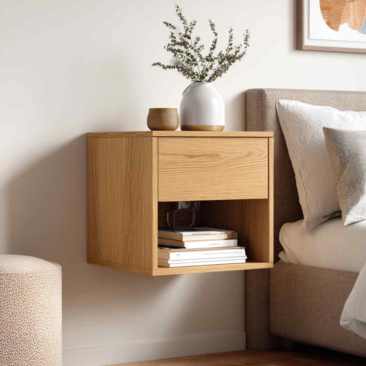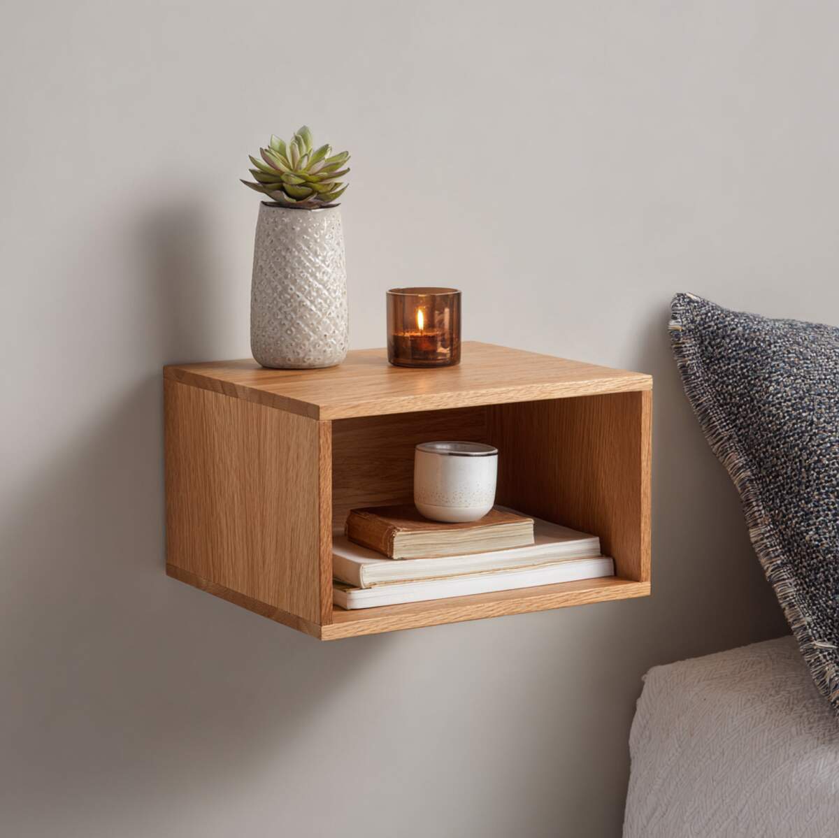 It offers both a surface on top and a little storage inside the cube. This design is important among wall-mounted nightstand ideas because it adds function without clutter.